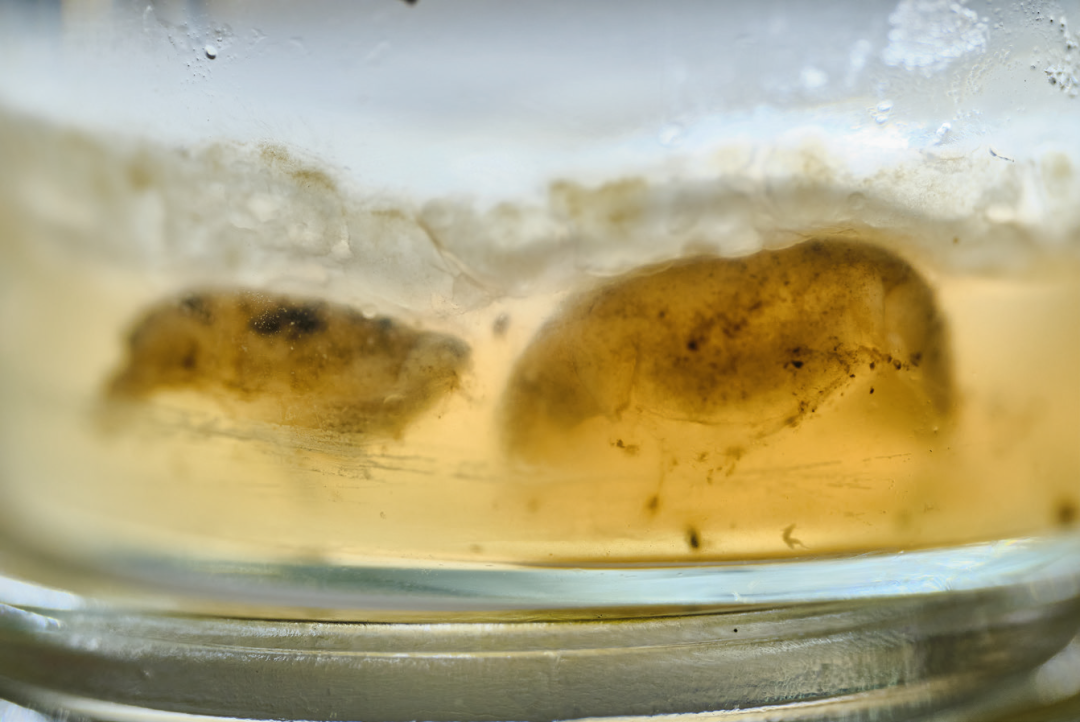 Кураторы: Поиск гриба — это был целый квест! Отдельно искали гриб, отдельно — керосин. Мы вышли для консультации на Анастасию Кривушину — кажется, единственного специалиста по керосиновому грибу в России. Нашли учебные образцы культуры гриба. А старый керосин, который мог бы быть заражен этим грибом, мы искали у авиационных реставраторов. Нам очень помог Илья Аксарин. В общем, способ через знакомых знакомых оказался гораздо эффективнее официальных запросов. Собрав образцы старого керосина, соединили их с образцом культуры гриба. Эксперимент удался — гриб начал разрастаться не только мицелием, но и давать плодовые тела: скорее всего так вышло, потому что в керосине была и дргая культура гриба.