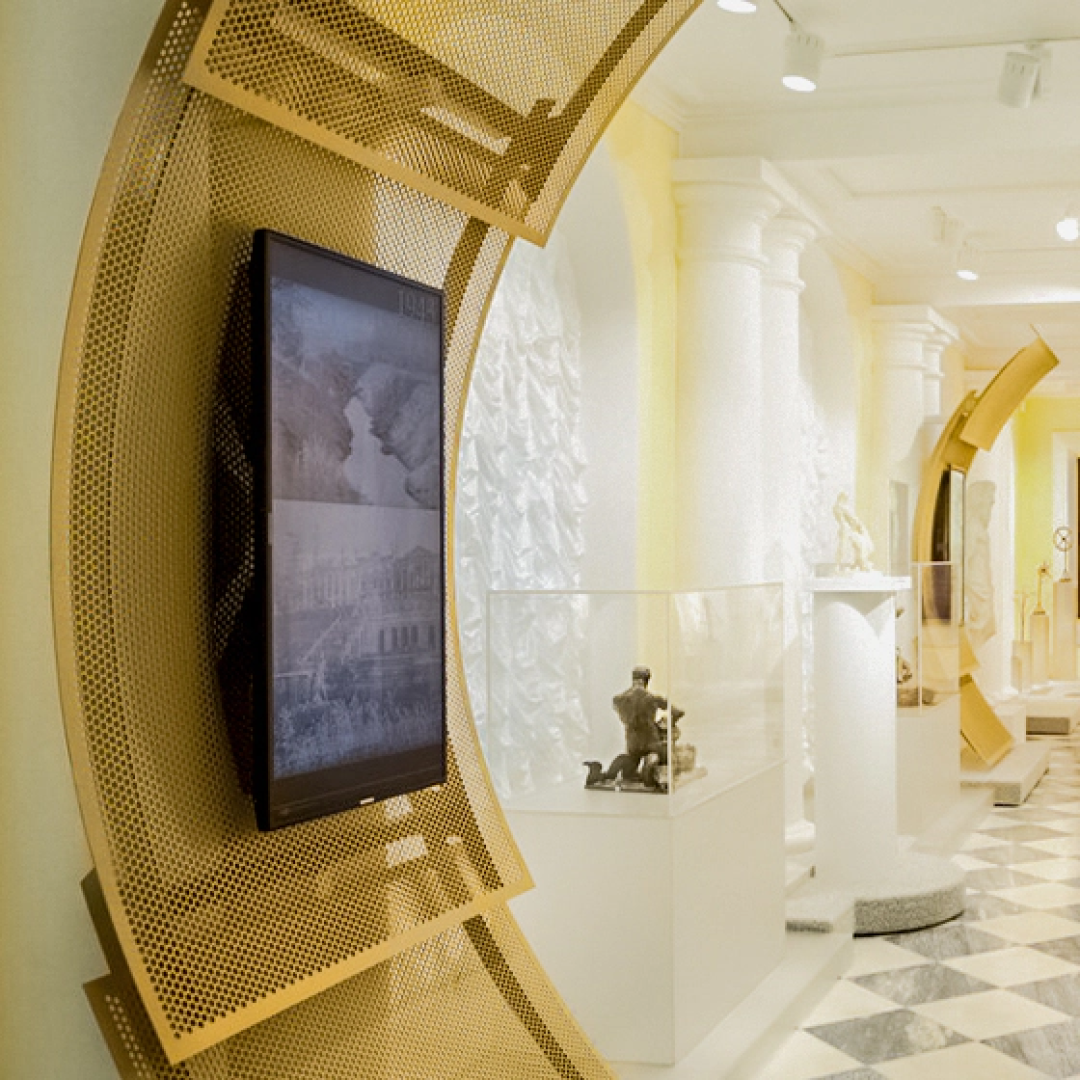 «В 2021 году фонтанному водоводу исполнилось 300 лет. Устройство фонтанов всегда интересовало посетителей музея-заповедника. Но продемонстрировать многокилометровый маршрут и скрытые под землей коммуникации ранее было невозможно. Приходилось буквально на пальцах рассказывать о том, что петергофские фонтаны работают без единого насоса. Решение включить в экспозицию современные технологии позволило наглядно показать создание и развитие фонтанной системы. Наравне с музейными экспонатами на экранах плазменных панелей в оцифрованном виде представлены редкие чертежи, архивные фотографии, рапорты, сметы и рисунки. Благодаря возможностям мультимедиа в музее сосредоточено огромное количество информации. Посетитель, управляя мультимедийным экраном, может проследить путь воды от родников на Ропшинских высотах через каналы и шлюзы к петергофским фонтанам. Или наблюдать анимированный чертеж фонтанного механизма».