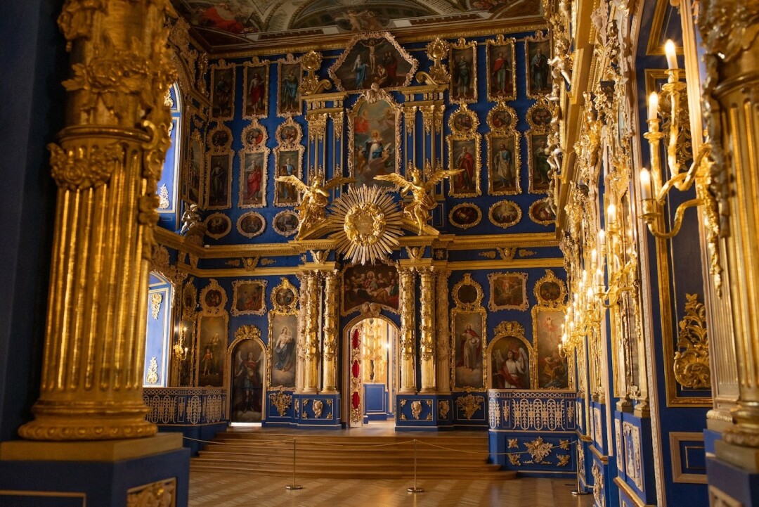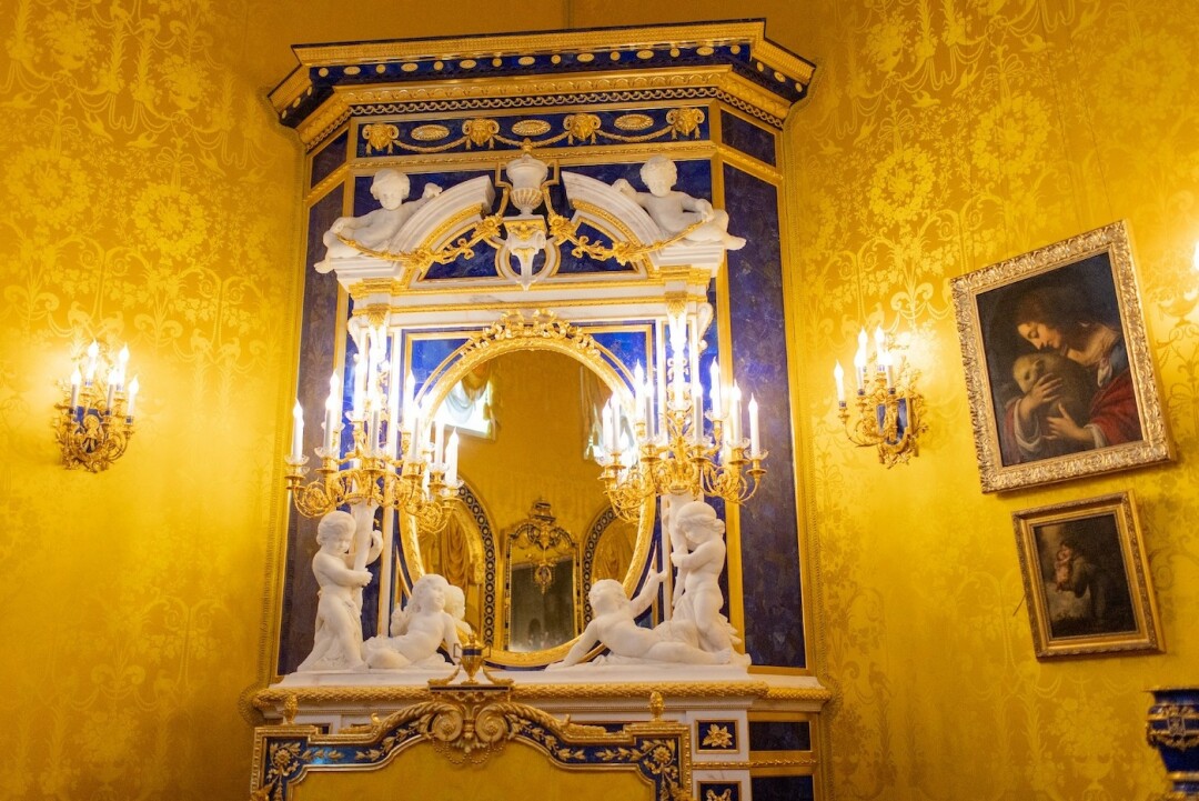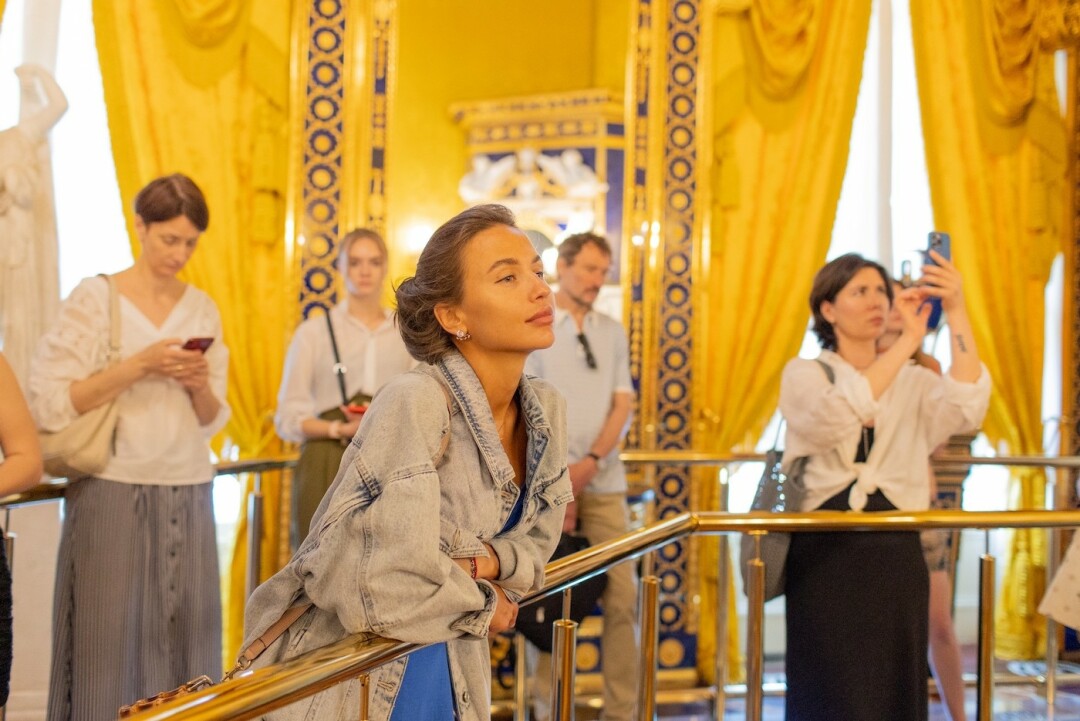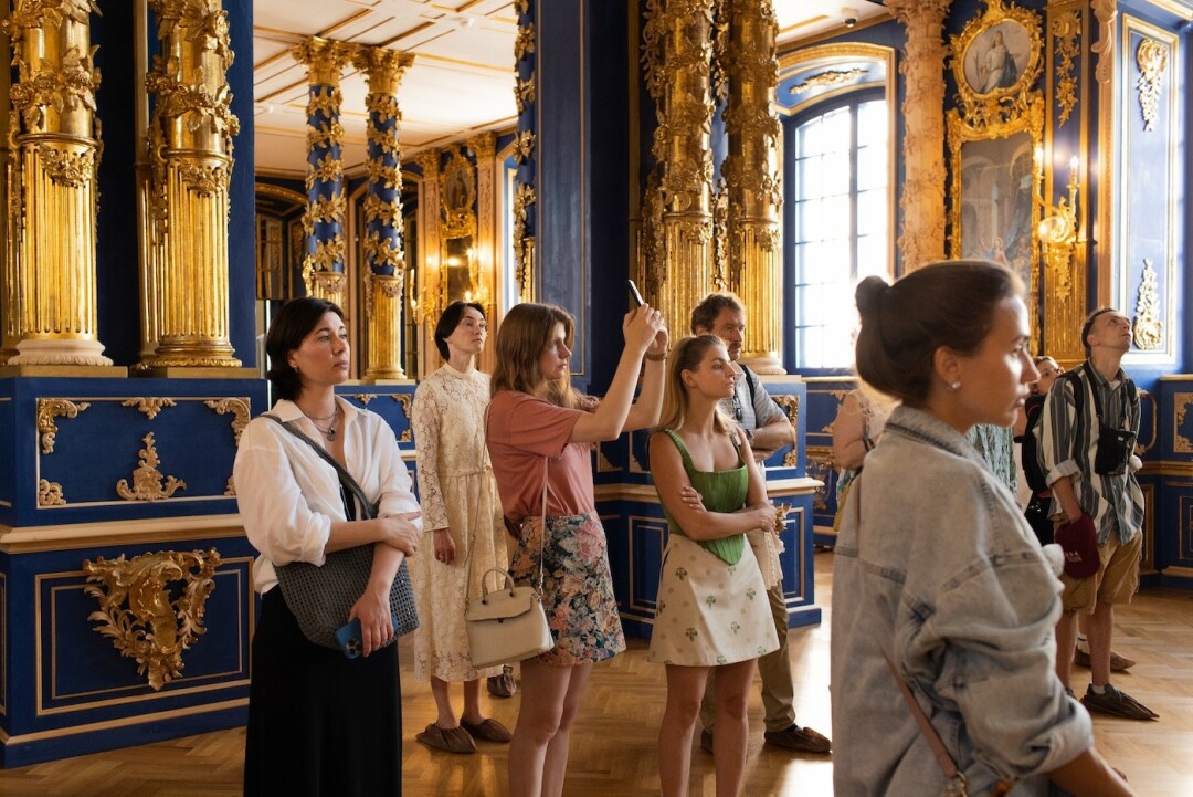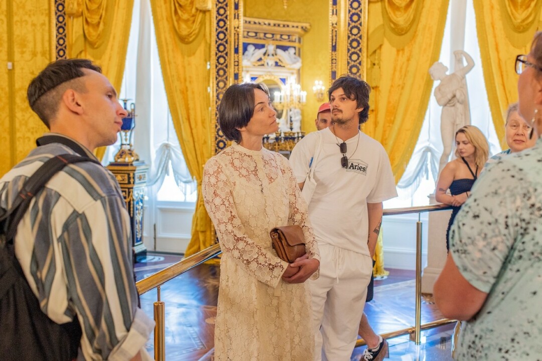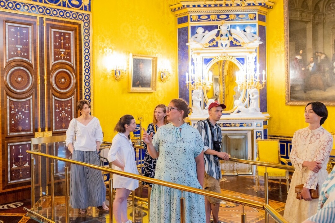Из церкви Воскресения Христова экскурсанты прошли через всю Золотую анфиладу дворца, чтобы полюбоваться ее роскошными интерьерами.