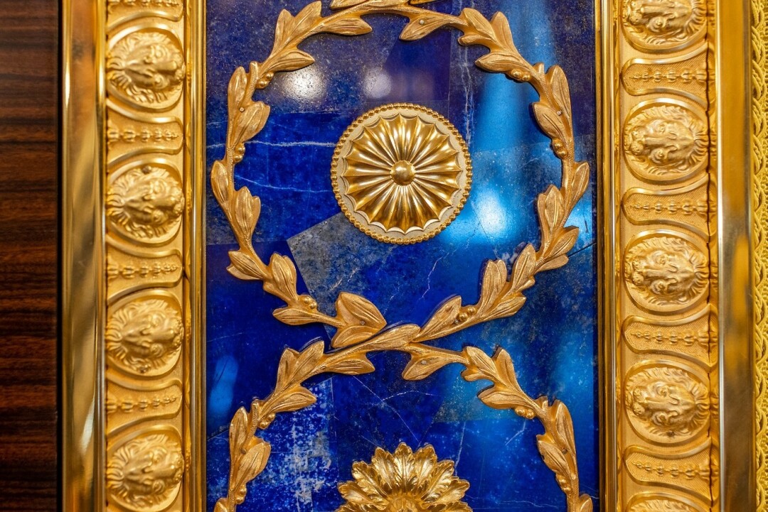 Камнерезы «Царскосельской янтарной мастерской» выполнили сложнейшие работы по облицовке помещения лазуритом. Других примеров работы с лазуритом в таком масштабе в технике русской мозаики в мире нет.