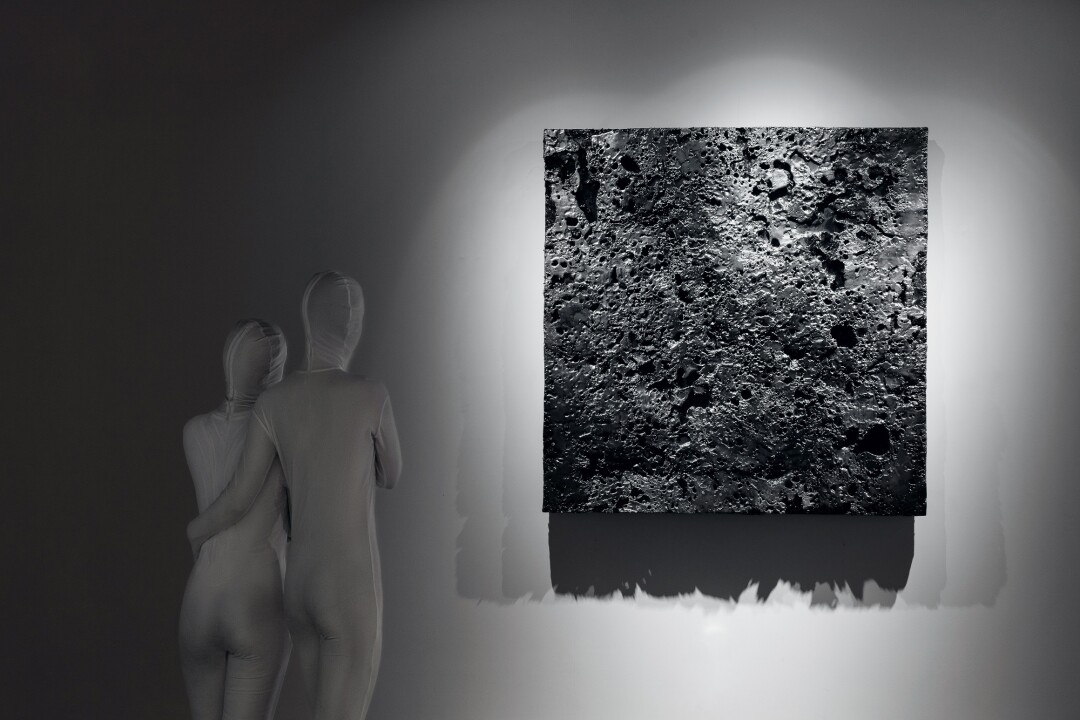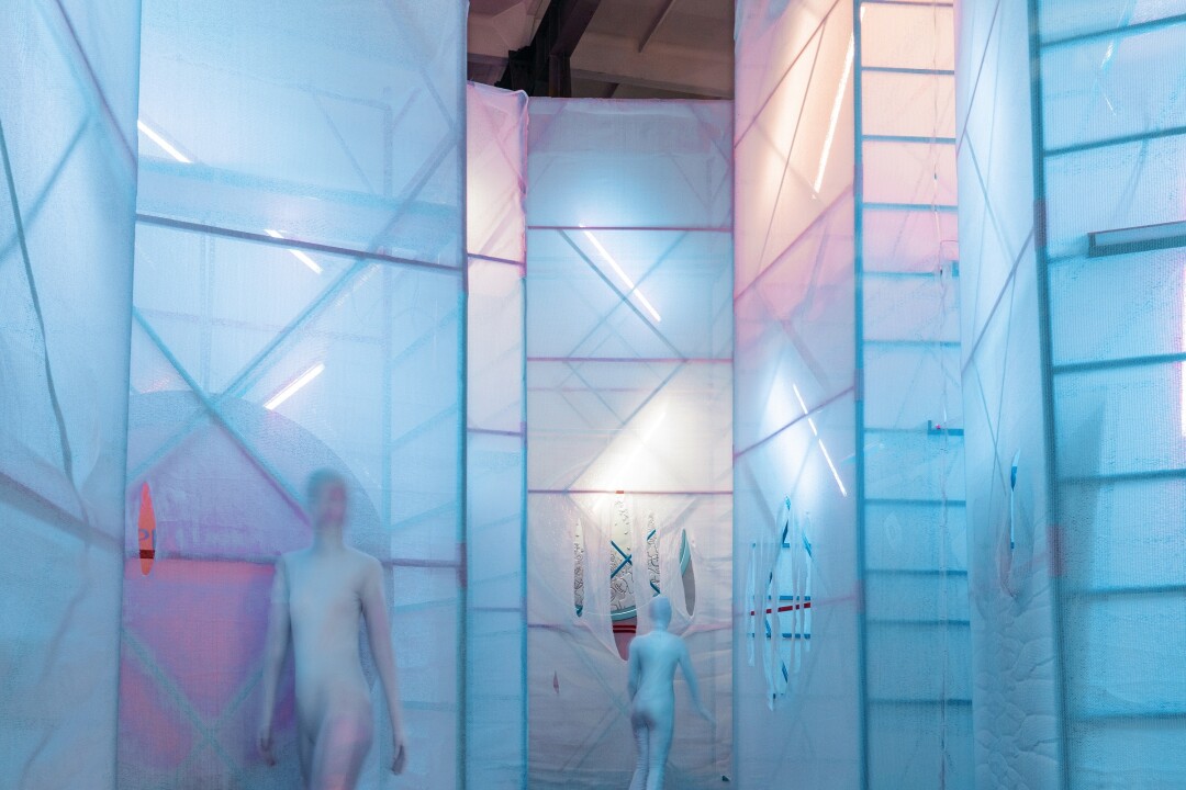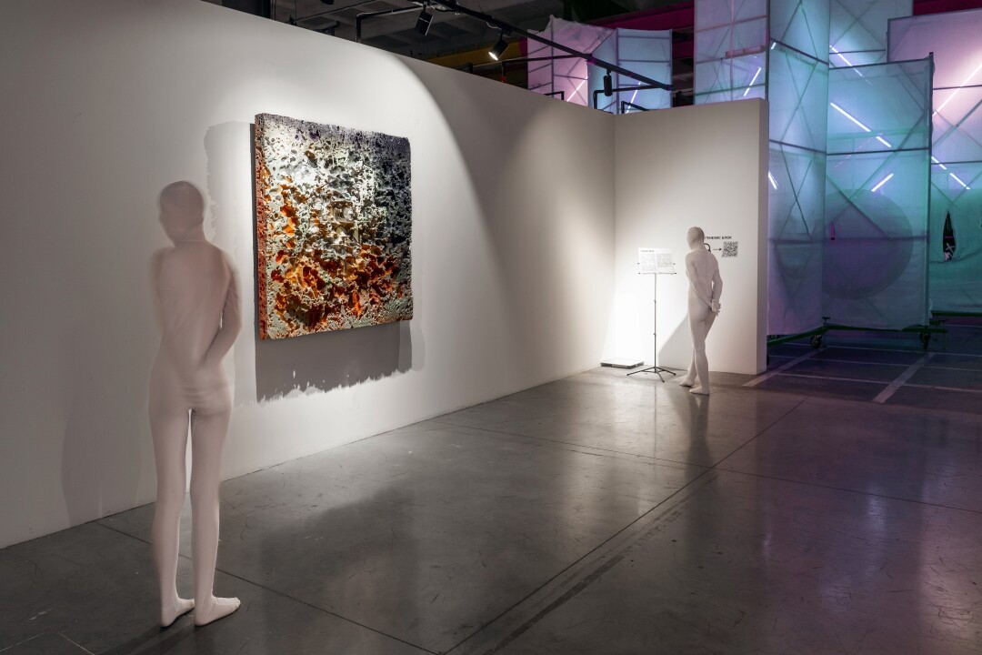 Другая важная тема — ощущение неопределенности будущего и неустойчивости настоящего. Очевиднее всего она воплощена в модуле «Лес», где представлена серия мозаик, выполненных по авторской технологии из переработанного пластика. Она была сделана в 2020 году: пандемия, движение BLM в Штатах, масштабные политические игры — PRANNA, как и многие, очень тяжело переживала то время и размышляла, к чему все это приведет. Так на ее картинах появились роботизированные ангелы в футуристических шлемах и Мадонна с младенцем в виде механического существа, олицетворяющего XXII век. Канонические мифологемы прошлого переосмысляются через призму современности и призывают задуматься о глобальных процессах.