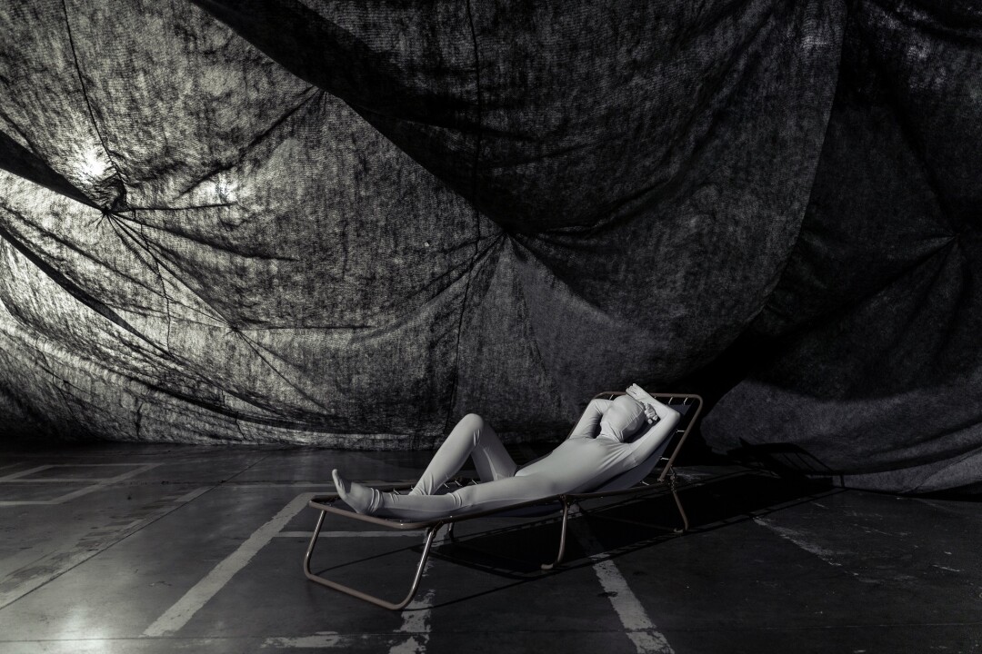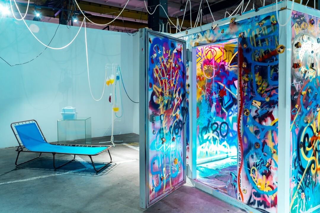 Зал «Время», пожалуй, один из самых интересных. Он представляет интерпретацию времени через метафору «время лечит». Здесь, с одной стороны, «место под солнцем» — место для отдыха. С другой, это больничная палата, но с третьей — это не что иное, как донорское отделение, где люди делятся витальной энергией, которая по большой запутанной системе переходит в некий артефакт, в коллективное сердце.
