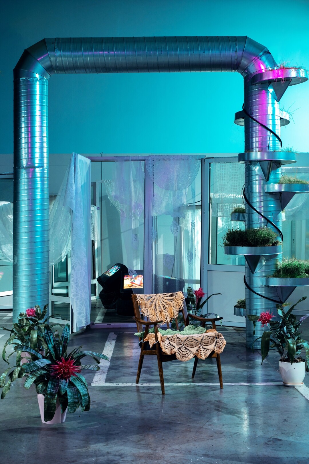 Следующий зал «Флорариум» воплощает триумф природного. Одновременно это симбиоз живого и рукотворного. Символ инженерной мысли — воздуховоды — превратились в основу для клумбы, душ — в систему полива растений. За старомодным креслом расположена ротонда, прикрытая кружевами и занавесками. Тут интересен мотив незащищенности «дома из стекла». XXI век — век отсутствия приватности, но, с другой стороны, домашний уют, семейные традиции, память о предках дают опору в ситуации глобальных перемен — болезненных, но неизбежных.