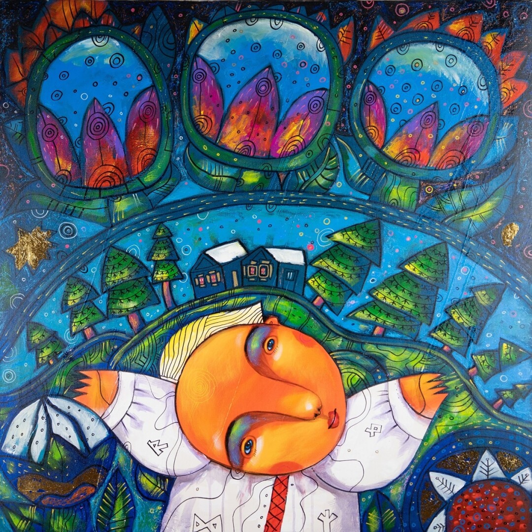 Это социальный проект, в который я пришла по велению сердца с желанием помочь исчезающему народу. Мне кажется, что я с ними теперь связана если не кровью, то потом точно! У народа водь одно слово может означать целую мысль, и когда я разложила эти мысли в картины, то объем визуального встал, как высокая гора над озером. Озеро — небольшое на поверхности, но очень глубокое. Гора высокая и большая, но она дает ощущение объема, скрытого под гладью озера.