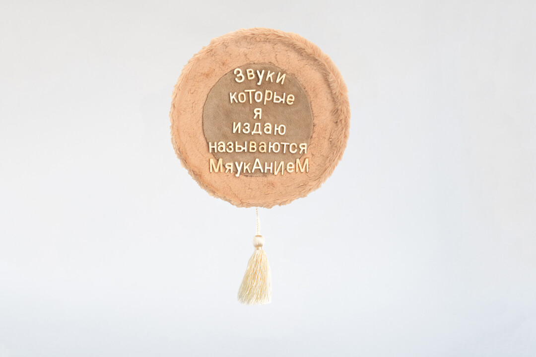 Работы искусствоведа и художницы Алины Глазун не имеют названий, но говорят сами за себя: леопардовый круг с пелевинским «Пустота», синий квадрат с усталыми игрушками и надписью «Все уснули» или овал с кисточками, как у гардин, и словом «Тоска». Для 2023-го же идеально подходит пушистый объект, намекающий на символ года, который не только кролик, но и кот: «Звуки, которые я издаю, называются мяуканьем».