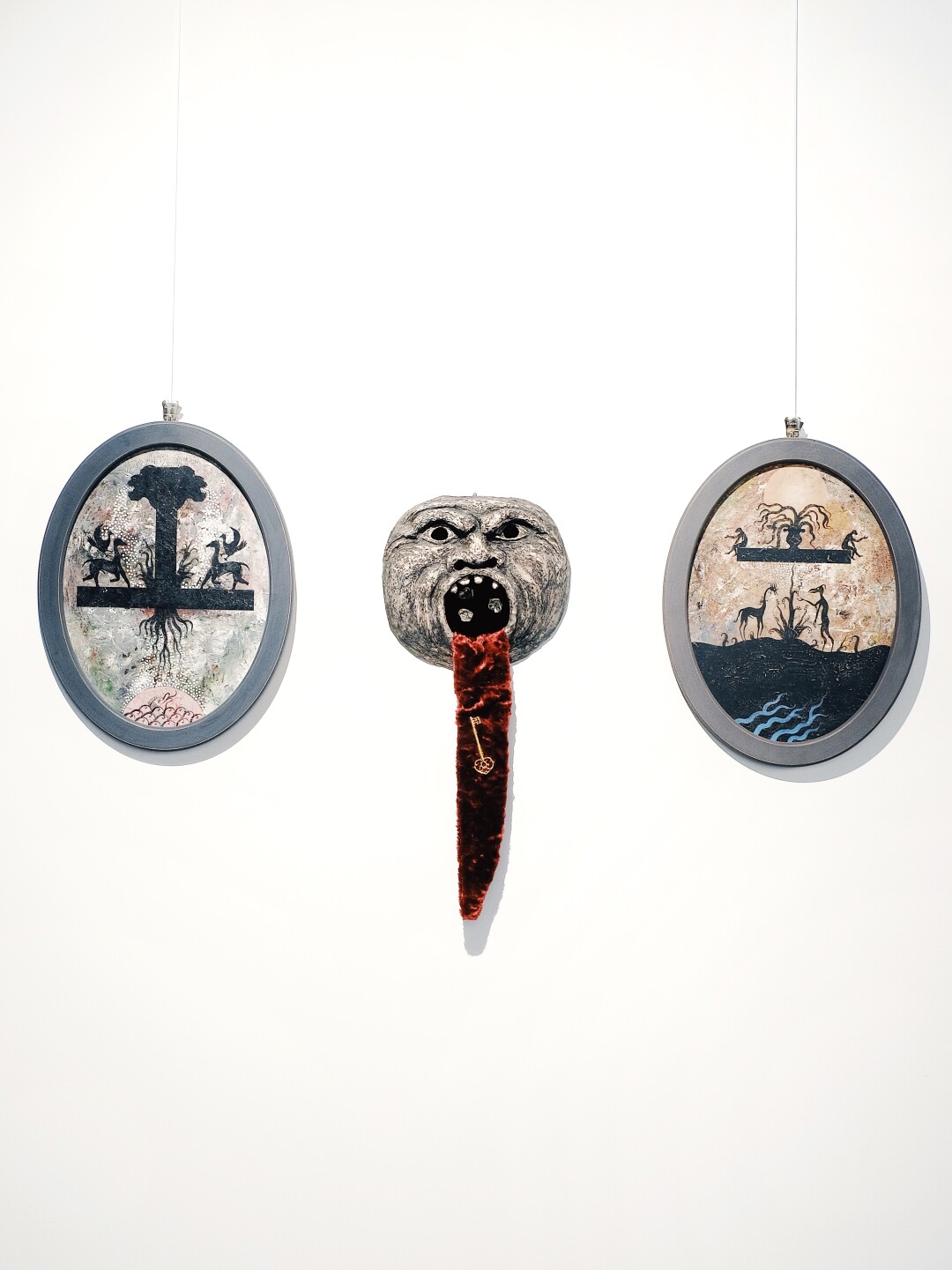 Так, лейтмотивом в произведениях Петровской выступает присутствие безымянной героини — ее путь, изгибы судьбы и внезапные озарения. В ее арсенале волшебные артефакты, которые служат в качестве испытаний, а персонажи-помощники для защиты и становления главного героя. Мифология работ Тимура Мусаева-Когана иная — в строгих формах прямоугольных рам и тондо, облаченные в дерево композиции отрешены от мира. Они про одиночество в толпе и инерцию в неопределенном пути. Его крупноформатные полотна полны имитацией древнего письма и запечатлением зверей из тибетской мифологии, что добавляет сходства с древними манускриптами — это цикл «Ткани темного мира».