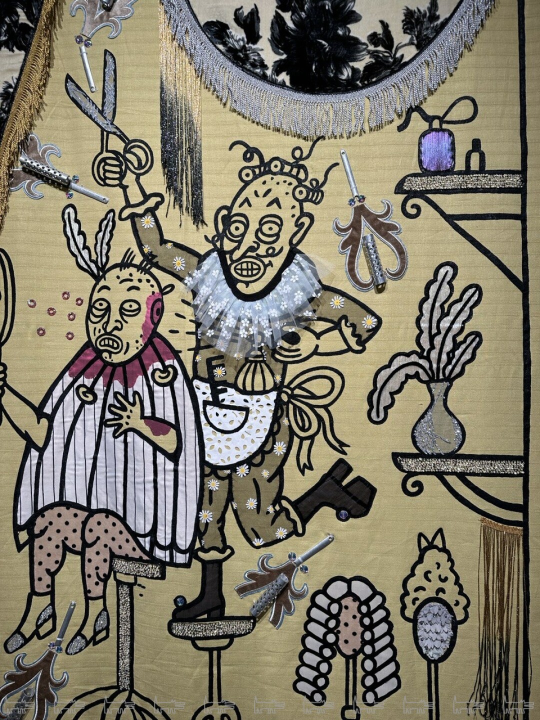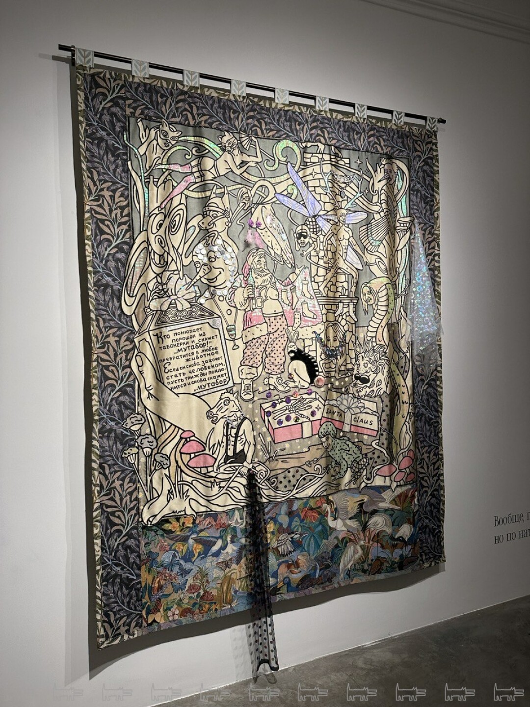 На выставке, которая сегодня открылась в галерее, показывают графические и расписанные текстильные панно с сюжетами актуальной новостной повестки, созданные на босхианский манер в ироничном ключе. На бал «королевства кривых зеркал» художница пригласила собирательные образы человеческих пороков в классических композициях лубка, окруженных религиозной символикой: «Меня интересует, как можно показать опыт человека через миф. Мои выставки визуально отличаются друг от друга, но темы схожи, они социальные и так или иначе связаны с мифологией», — объясняет Людмила Баронина. На выставке встретишь знакомых персонажей в современных образах в вакханалии хаотичных сюжетов от Акулы у акулиста до заклинательной оды скандальному Мутабору.