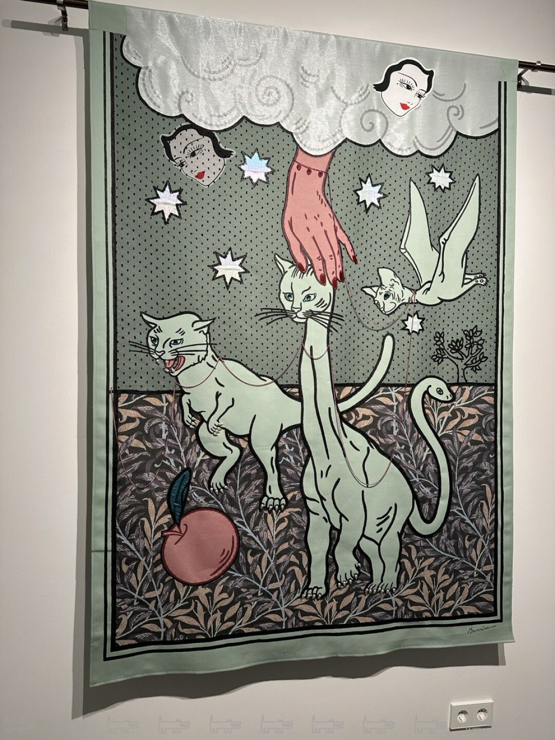 Современная художница из Краснодара обращается к эстетическим канонам прошлого — ее переосмысление русского лубка, текстильные инсталляции и крупноформатные панно, напоминающие старые гобелены, формируют прямой диалог новейшего искусства с историческим.