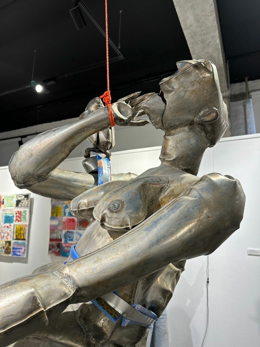 Дутая металлическая скульптура Вильгения Мельникова «Форма 3», изображающая сплетение двух человеческих тел и одной птицы (ее художнику помогла сделать дочь!). Техническая сторона создания объекта непосредственно связана с темой выставки — надувание металла для создания формы техникой гидроформинга (внутрь металлической оболочки закачивается жидкость под высоким давлением и растягивает ее, придавая объекту округлую форму) позволяет контролировать форму лишь на 85%, а остальная часть скульптуры естественно рождается сама.