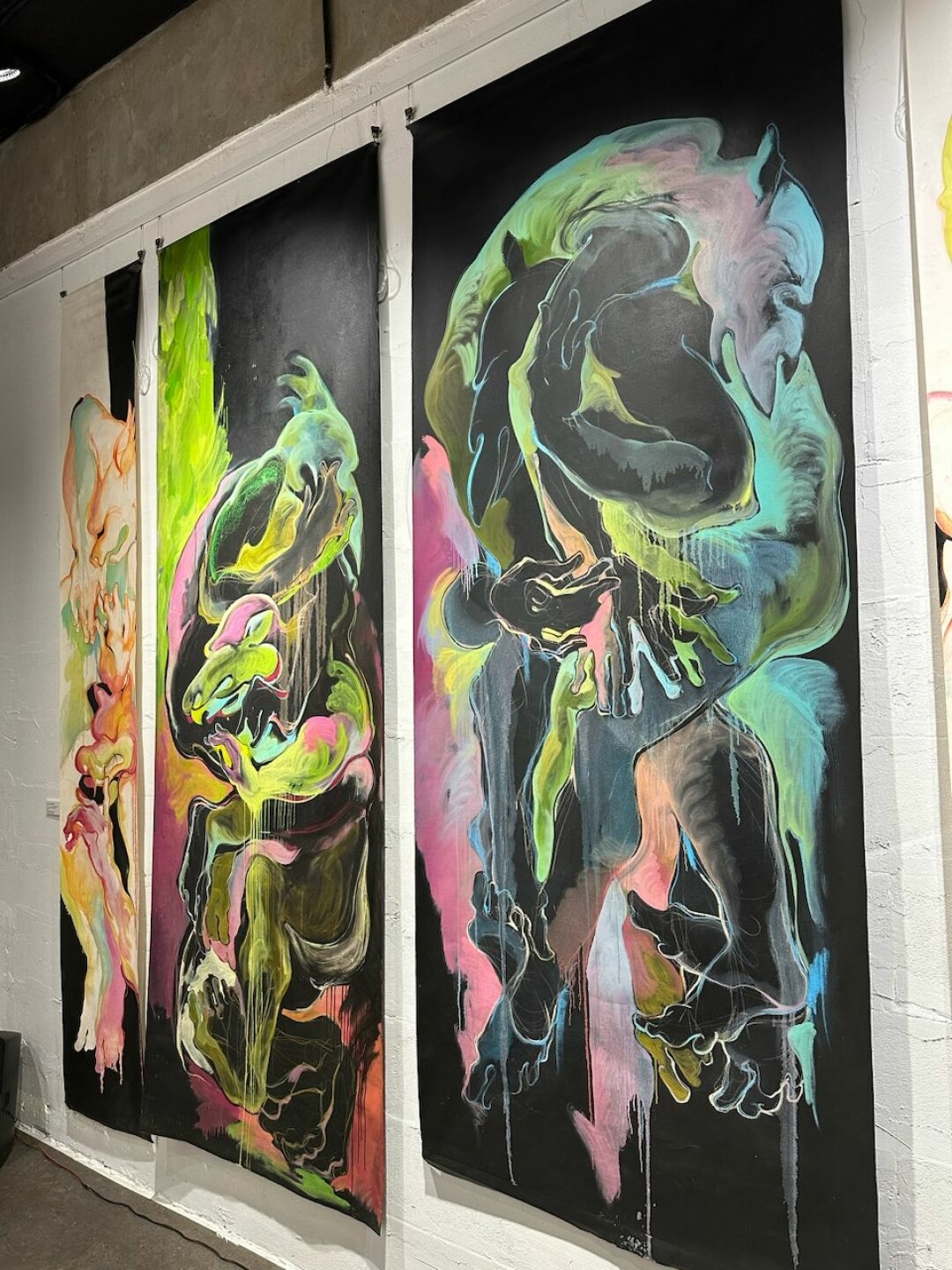Живописные холсты Алисы Гореловой, неожиданно экспонируются как средневековые знамена — на крупноформатных триптихе и квадриптихе запечатлена какофония из множества ярких почти экспрессионистических в цвете и форме тел. Среди них нечетко и хтонически тревожно различаются вылепленные атлетичные формы — кисти и ноги человеческих фигур разрывают холст в попытке сломать четвертую стену.