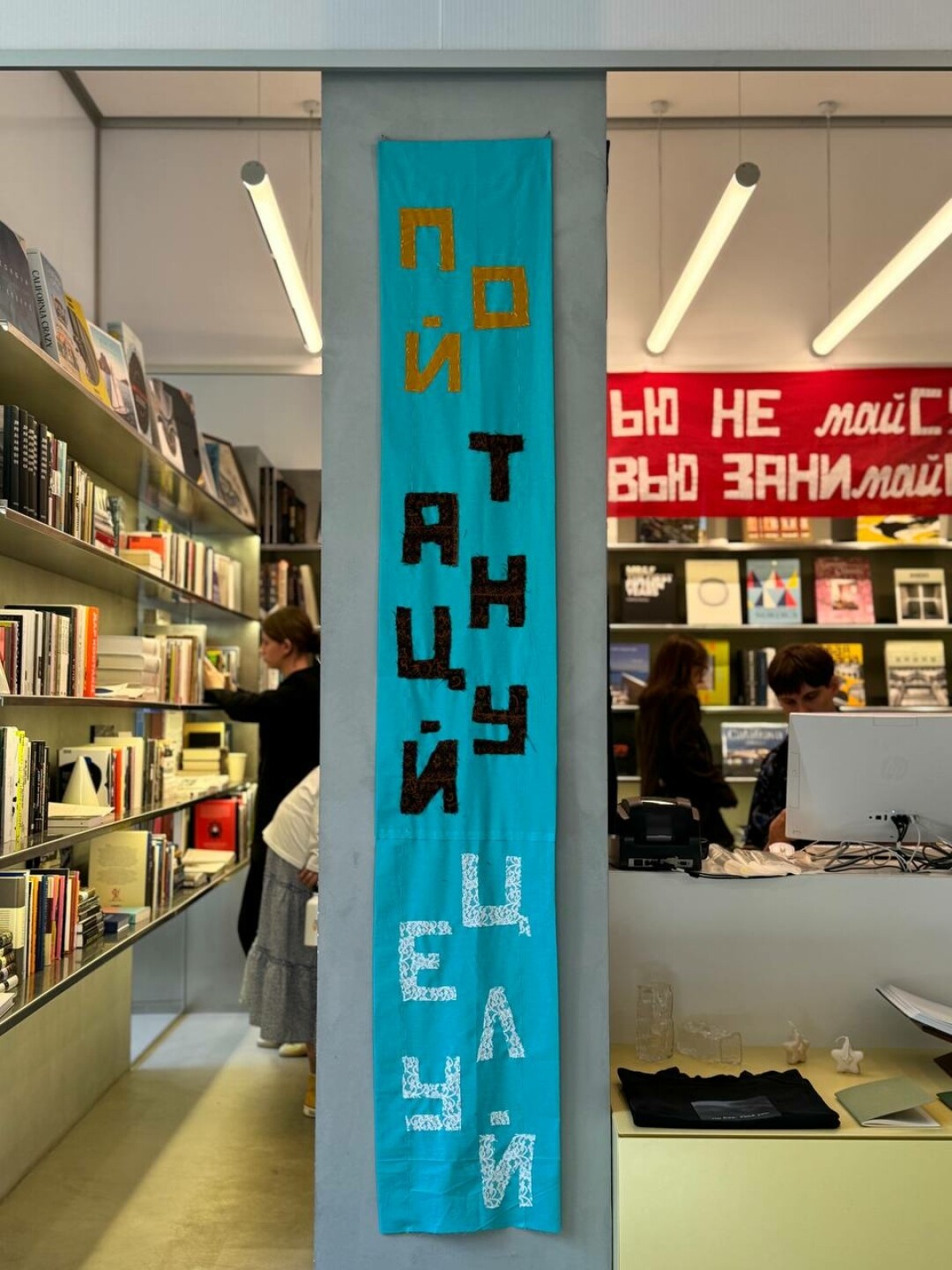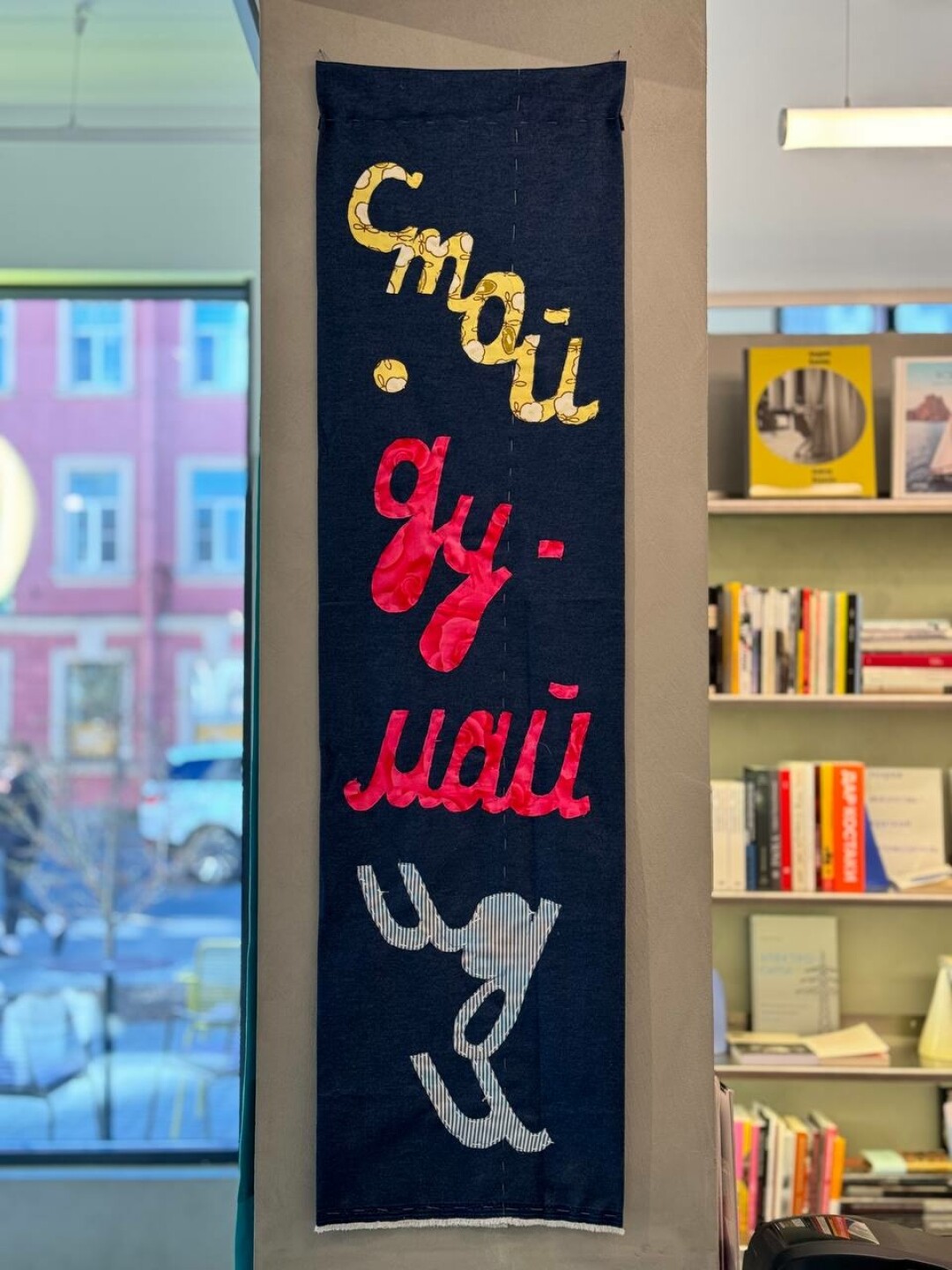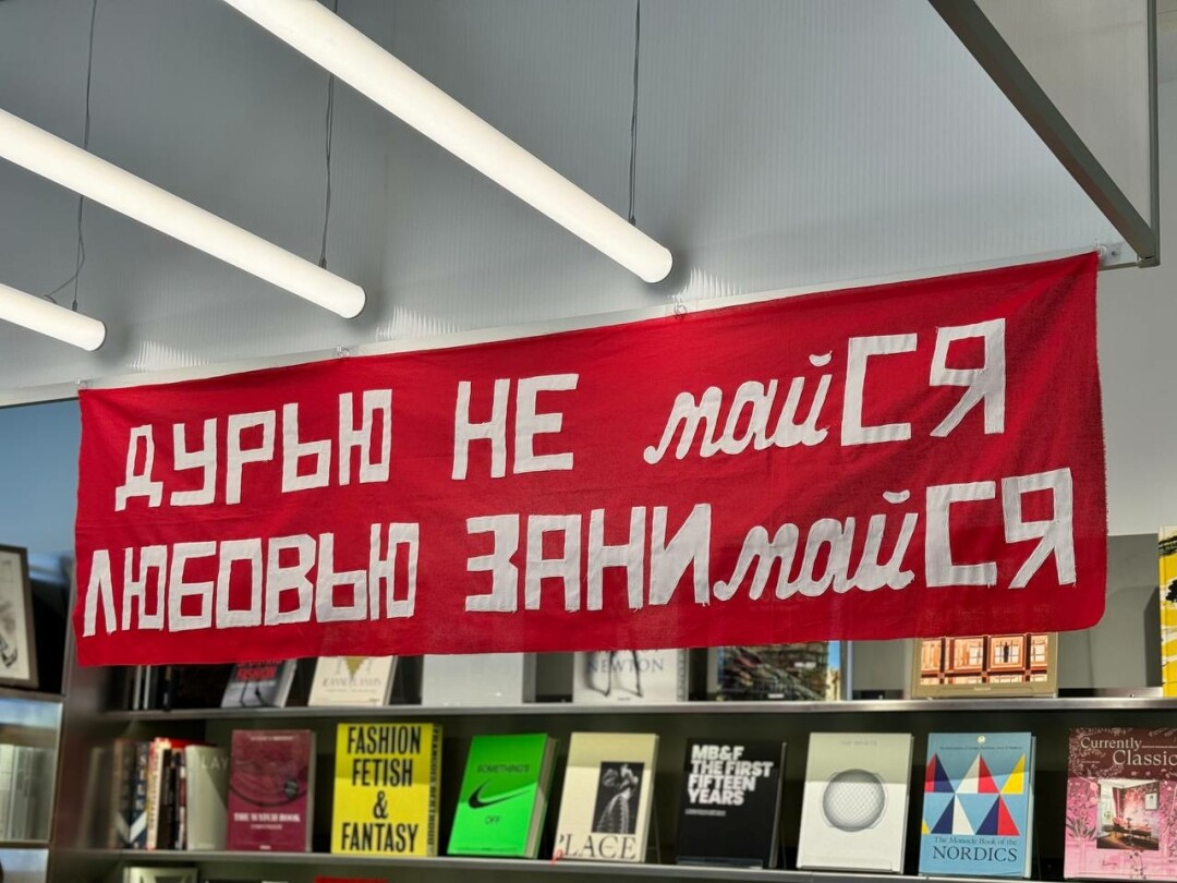 «Люби и обни-май», «Дурью не май-ся, любовью зани-май-ся» и «Мир, труд, май»: такими утверждающими слоганами от петербургского художника украшены залы книжного Masters bookstore на «Левашовском Хлебозаводе» до конца мая.