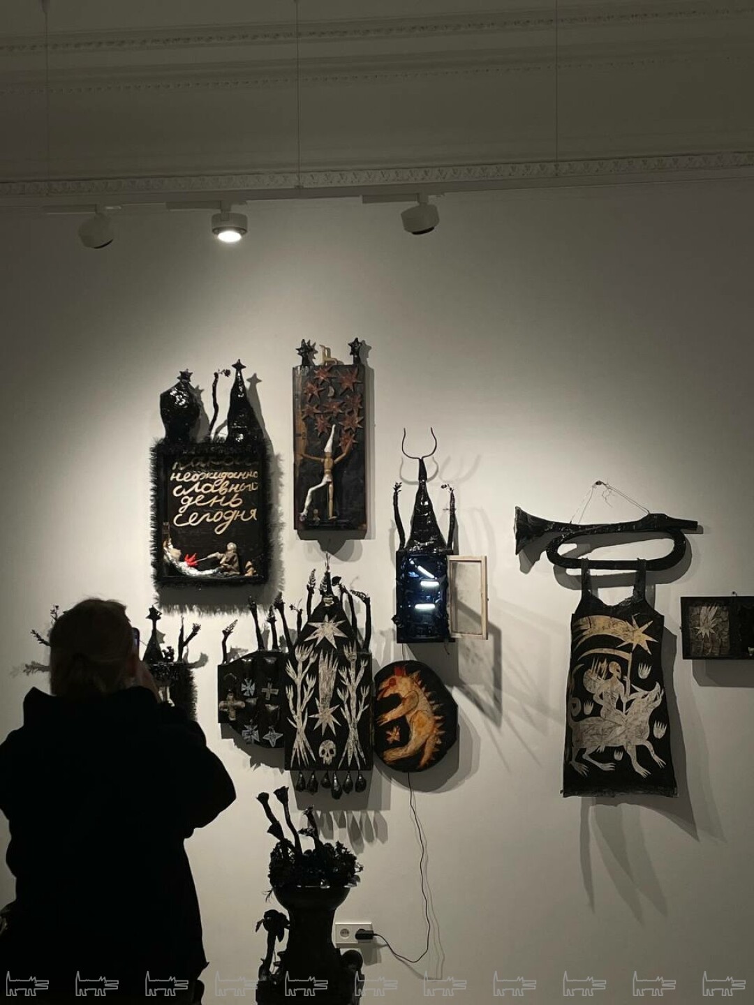«Самобытная мистическая философия Вадима Михайлова превращена в зловещий, залипший в левкасе и черном масле театр, где застывшие герои воздевают к небу руки с тянущимися вязкими нитями, цепко затягивающими назад, в болото», — отмечает куратор выставки Петр Белый.