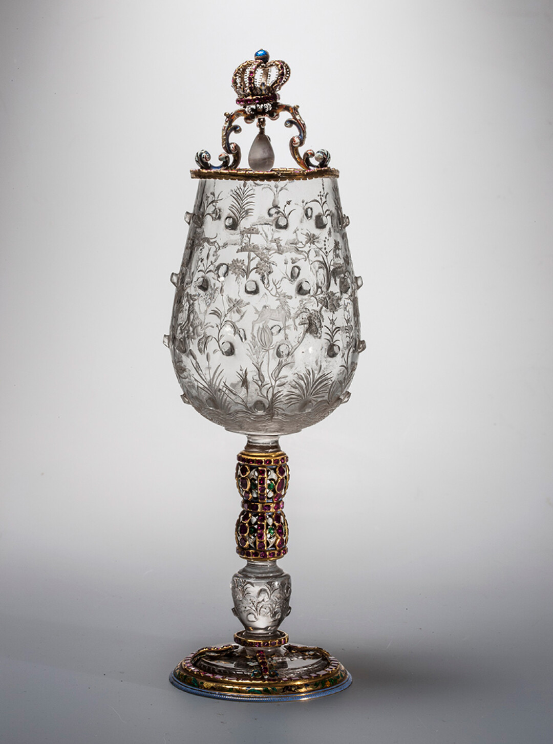 Кубок, подаренный курфюрстом Саксонии и королем Польши Петру I в честь заключения союза против Швеции, венчает золотая корона, подчеркивающая высокий статус заказчика.