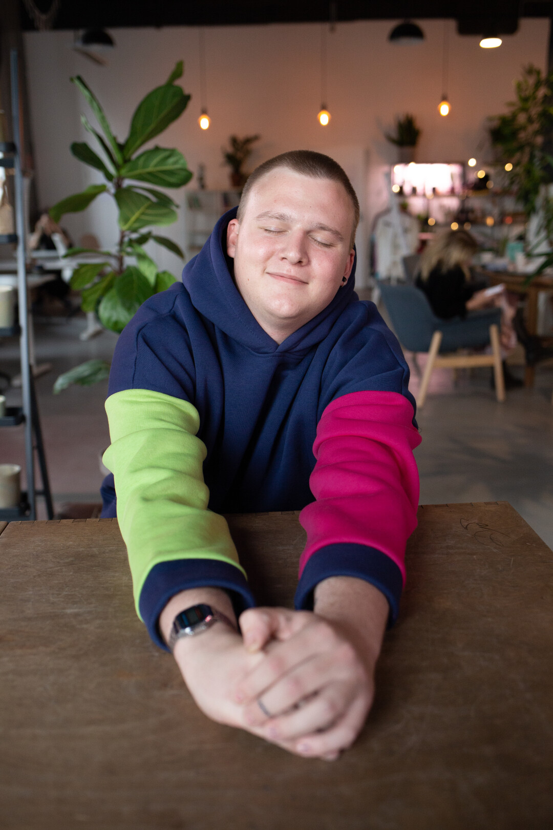 Сева устроился в мастерские в 2022 году. Он работал в графической мастерской, где начал развиваться как художник, прошел обучение в школе бариста — специальном проекте «Простых вещей», который помогает ребятам с ментальными особенностями выходить на рынок труда. Сейчас Севу можно встретить за баром в «Огурцах» — он принимает заказы, готовит кофе и другие напитки в вегетарианском кафе на Набережной Фонтанки, 96. Здесь и пройдет первая персональная выставка Севы.