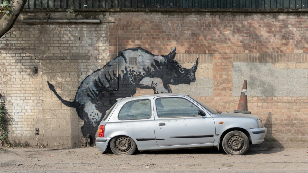 Новый мурал, созданный в классическом для Бэнкси трафаретном стиле, изображает носорога, забирающегося на серебристый Nissan Micra с дорожным конусом на капоте. Стрит-арт был опубликован в социальных сетях без пояснительного комментария. В сети предполагают, что с помощью новых муралов художник обращает внимание на проблему вымирания животных.