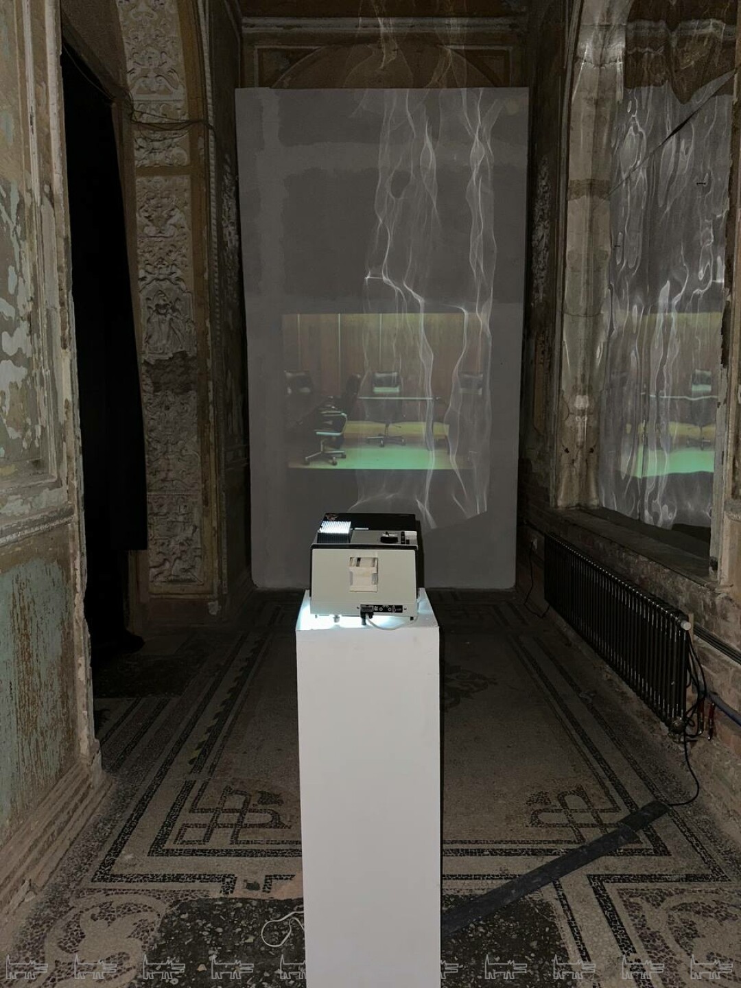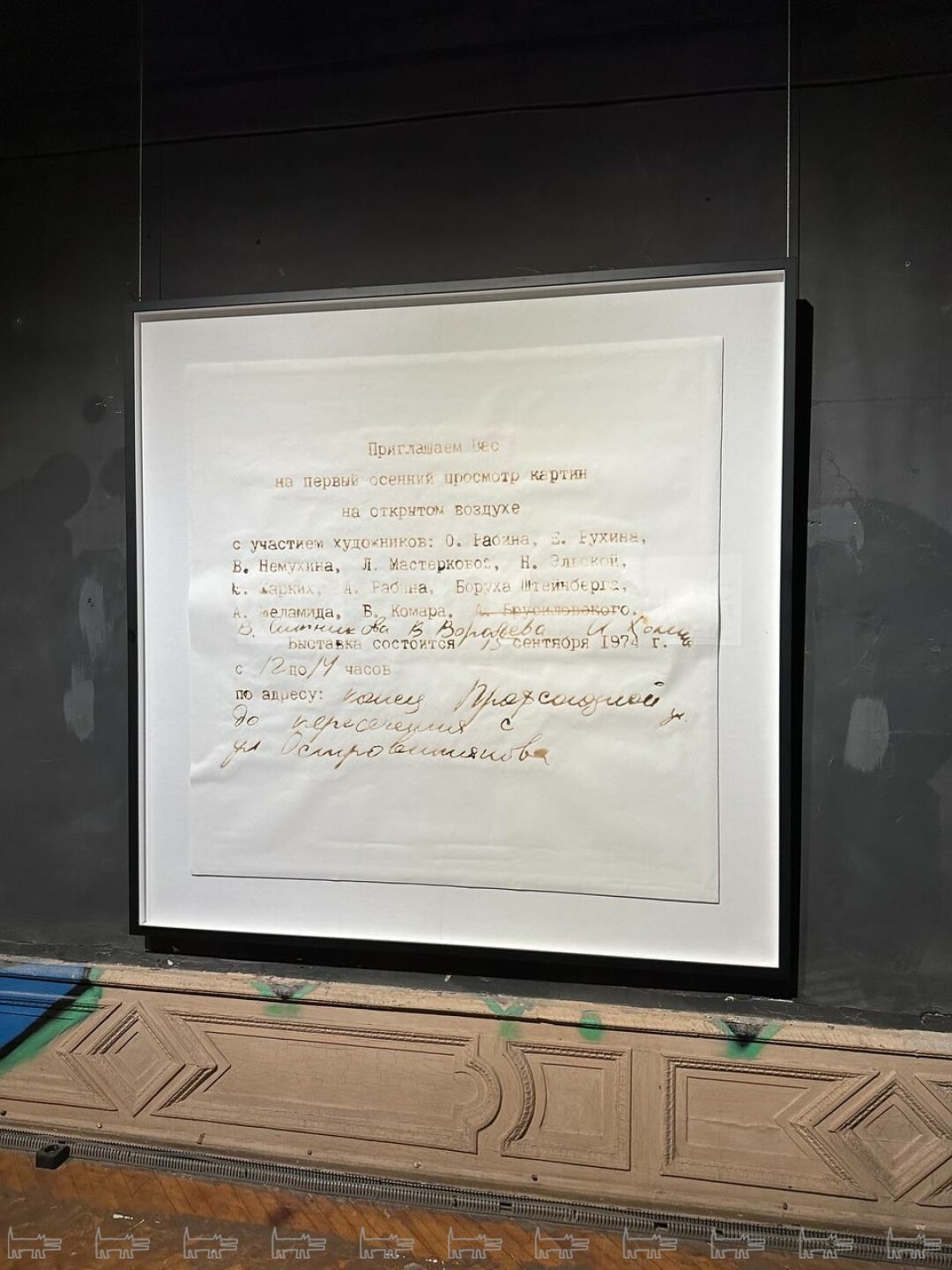 Также показали абстрактную медитативную живописные работы Ивана Новикова, в интерьерах особняка напоминающую окна в пасмурный день. В этой серии художник переосмысливает историческое прошлое СССР, исследуя конфликты и идеологию через призму постколониальной теории. К теме прошлого обратился и Владимир Потапов в своей серии «Огненная графика», выполненной в экспериментальной технике — специальный раствор, который наносится на бумагу, а после поджигается и тлеет. Работы посвящены ключевому событию второй волны авангарда — Бульдозерной выставке 1974 года, когда произведения нонконформистов массово были уничтожены. «Скрытое» возвращает этим художникам право голоса.