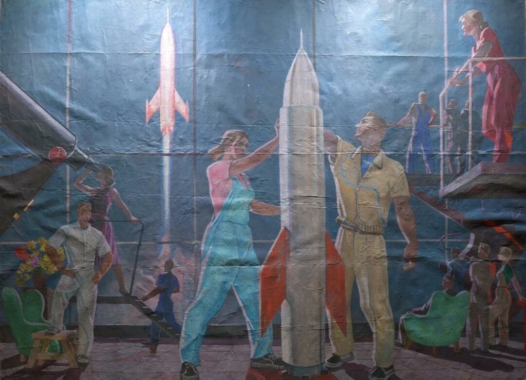 Монументальное полотно в «стиле Сталин» (как соцреализм некогда окрестил арт-критик Борис Гройс) было написано одним из ключевых художников эпохи Александром Дейнекой в 1960-х годах аккурат после первого полета Юрия Гагарина в космос. Первоначально картина была создана как эскиз к фрагменту будущей многосоставной мозаики, которая должна была украсить московский Дворец съездов. Подобно другим работам, выполненным с технике социалистического реализма, композиция «Покорители космоса» отражает основополагающие контексты — оптимизм, коллективистское стремление к прогрессу и романтическое представление о будущем.