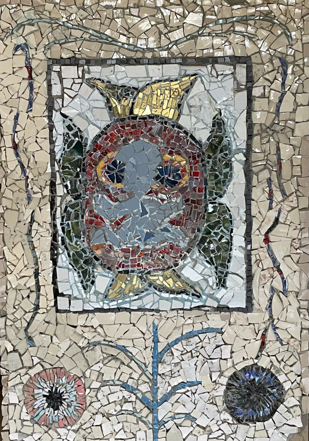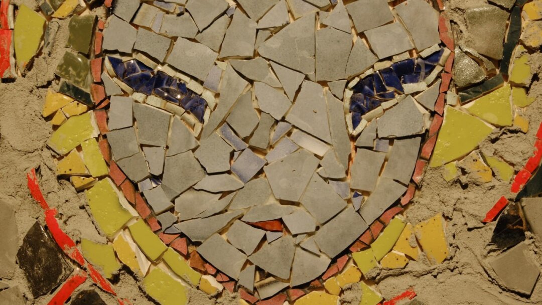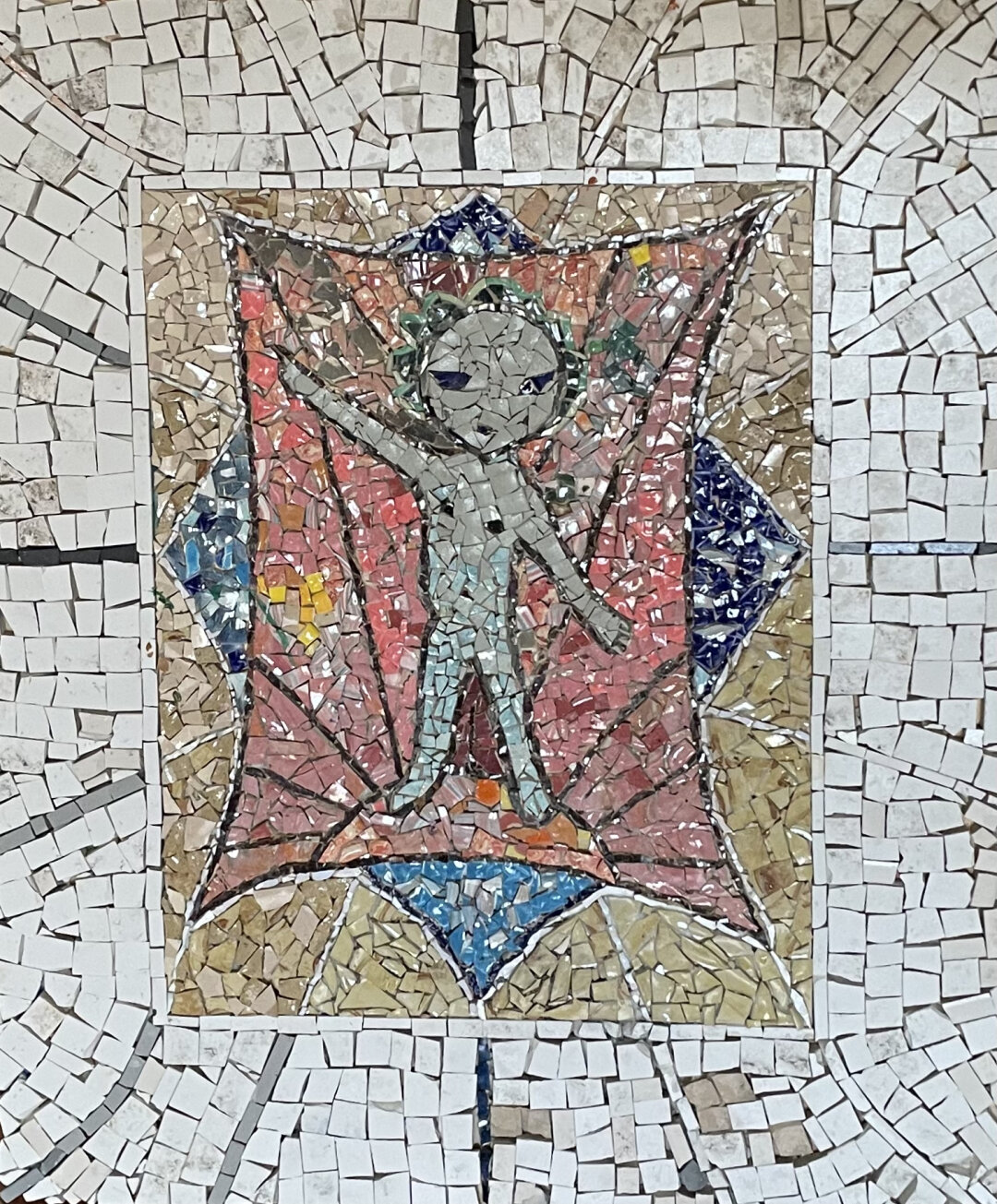 Технологически работы Лены Минаевой остаются в рамках классической техники мозаики, идеологически происходит переход на другой уровень. Посланец, прибывший с небес с неясной миссией – почти реальный персонаж детства автора. Перестроечная эклектика в данном случае носит для художника ностальгический характер утраты «золотого века».
