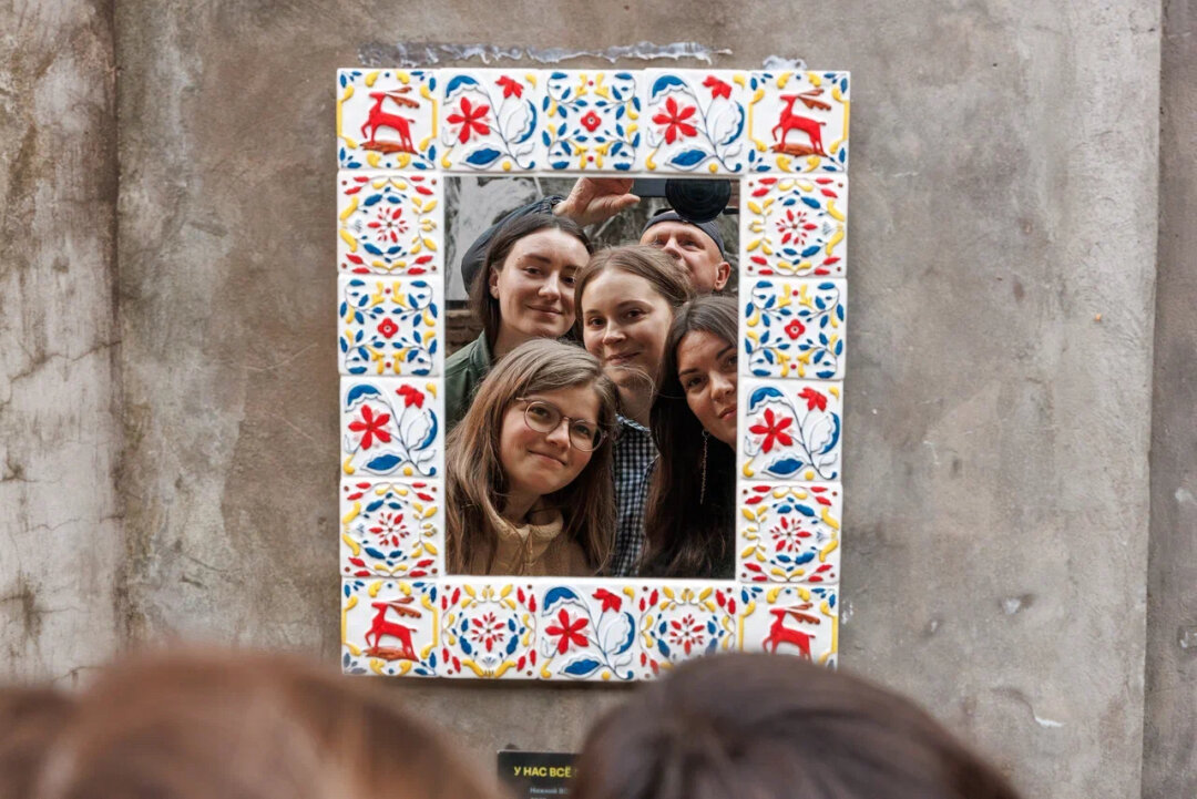 Рамки трех зеркал, созданных мастерской «Ресурс 52» из керамической плитки, имитируют старинные изразцы.