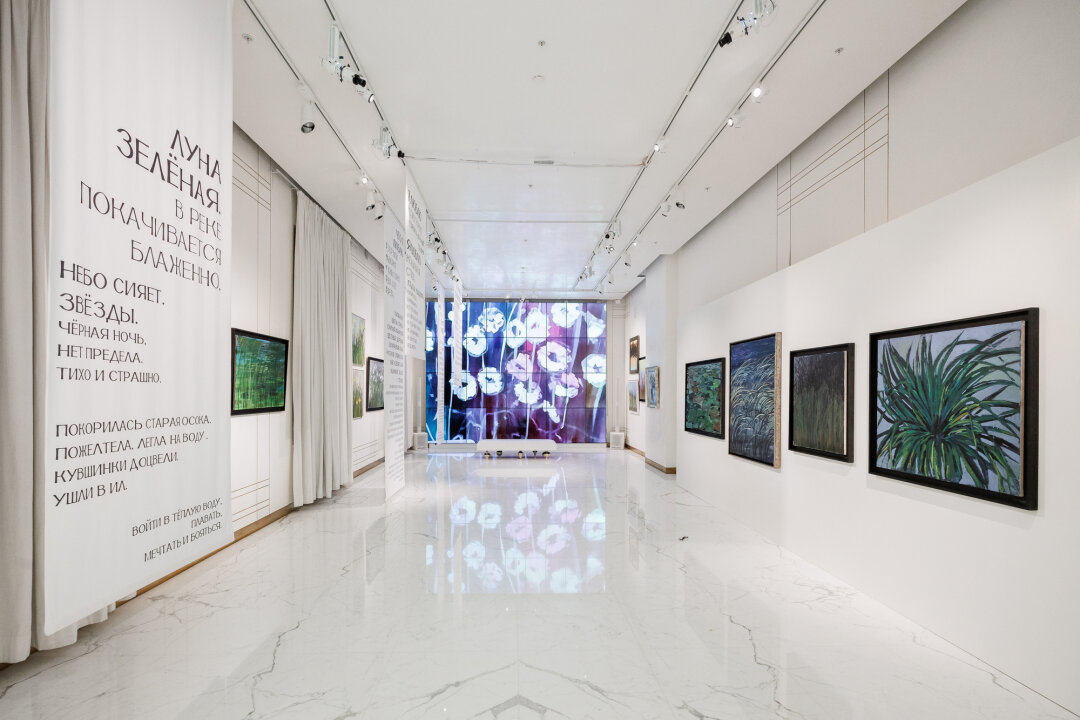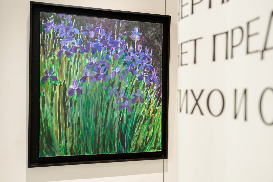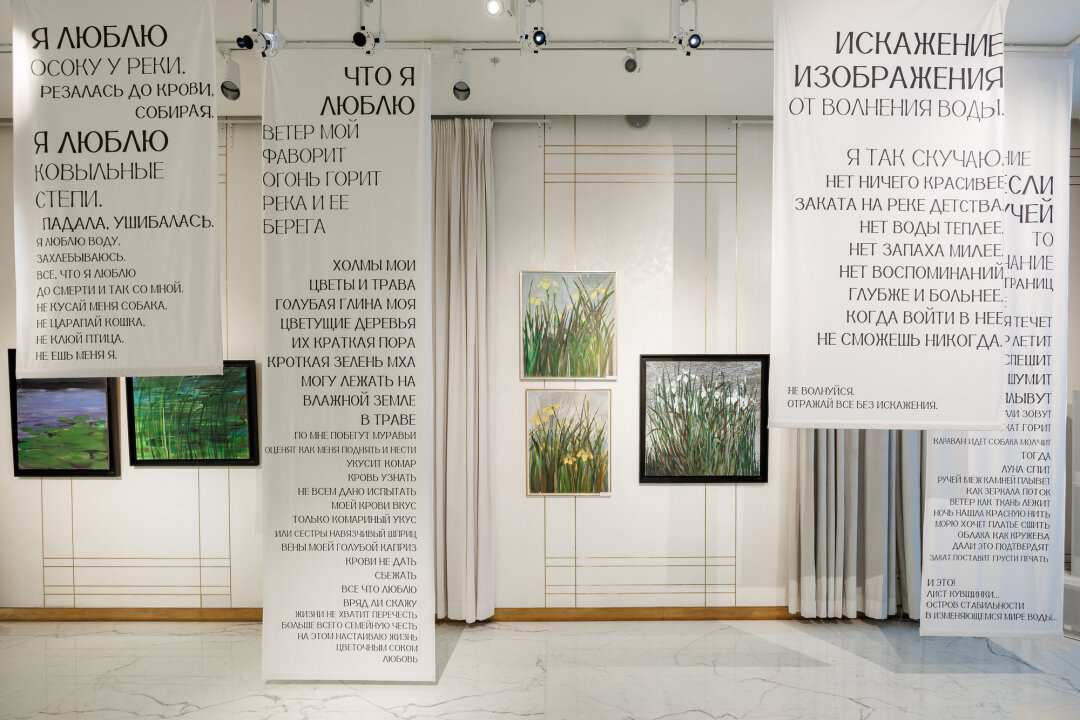 «Вот тебе цветок. Фиалки заглядывают в душу. Сирень не может определиться, дать счастья или нет. Вьюнок проползет и опутает сознание. Роза заставит задуматься, достаточно ли ты любима. Аквилегия высушит слезы. Циннии скажут правду. Обманут незабудки! Георгины и гладиолусы дарите мужчинам. Мужчины любят победы. Флаги и фейерверки. Ландыши заставят вспомнить бабушкину страшную сказку. Не все так просто. Собрала букет, не нюхай. Унесёт!», — тексты, внедренные в экспозицию, выводят ее за пределы визуального восприятия и превращают выставку в доверительный разговор о важном.