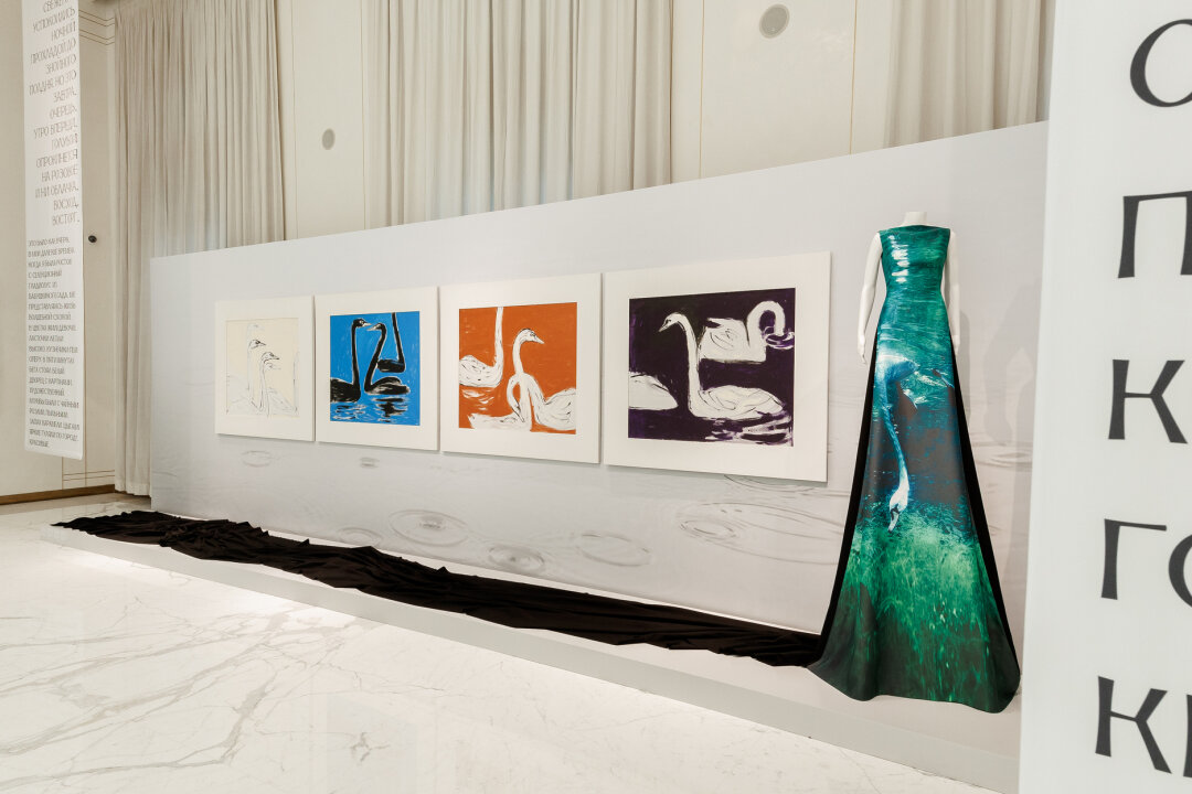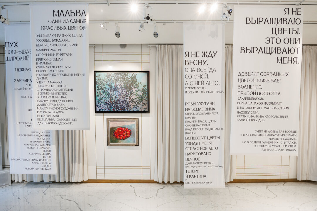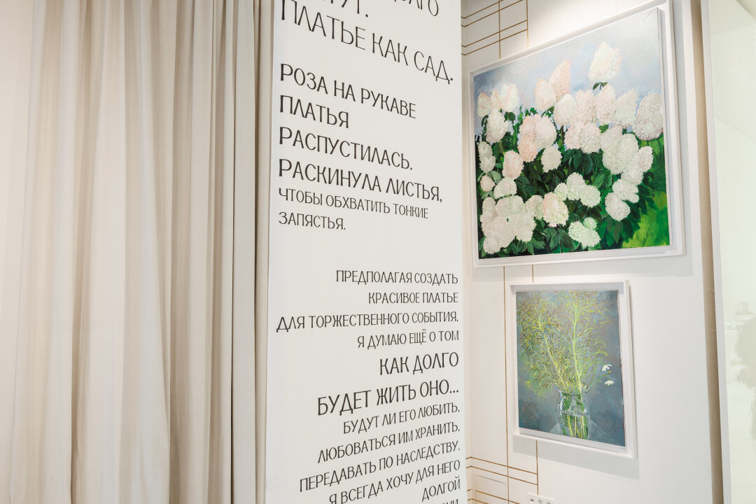 На картинах — цветы из собственного сада дизайнера, вдохновляющие ее на создание новых коллекций. На баннерах — воспоминания и проникновенные размышления о природе в форме философских сентенций.