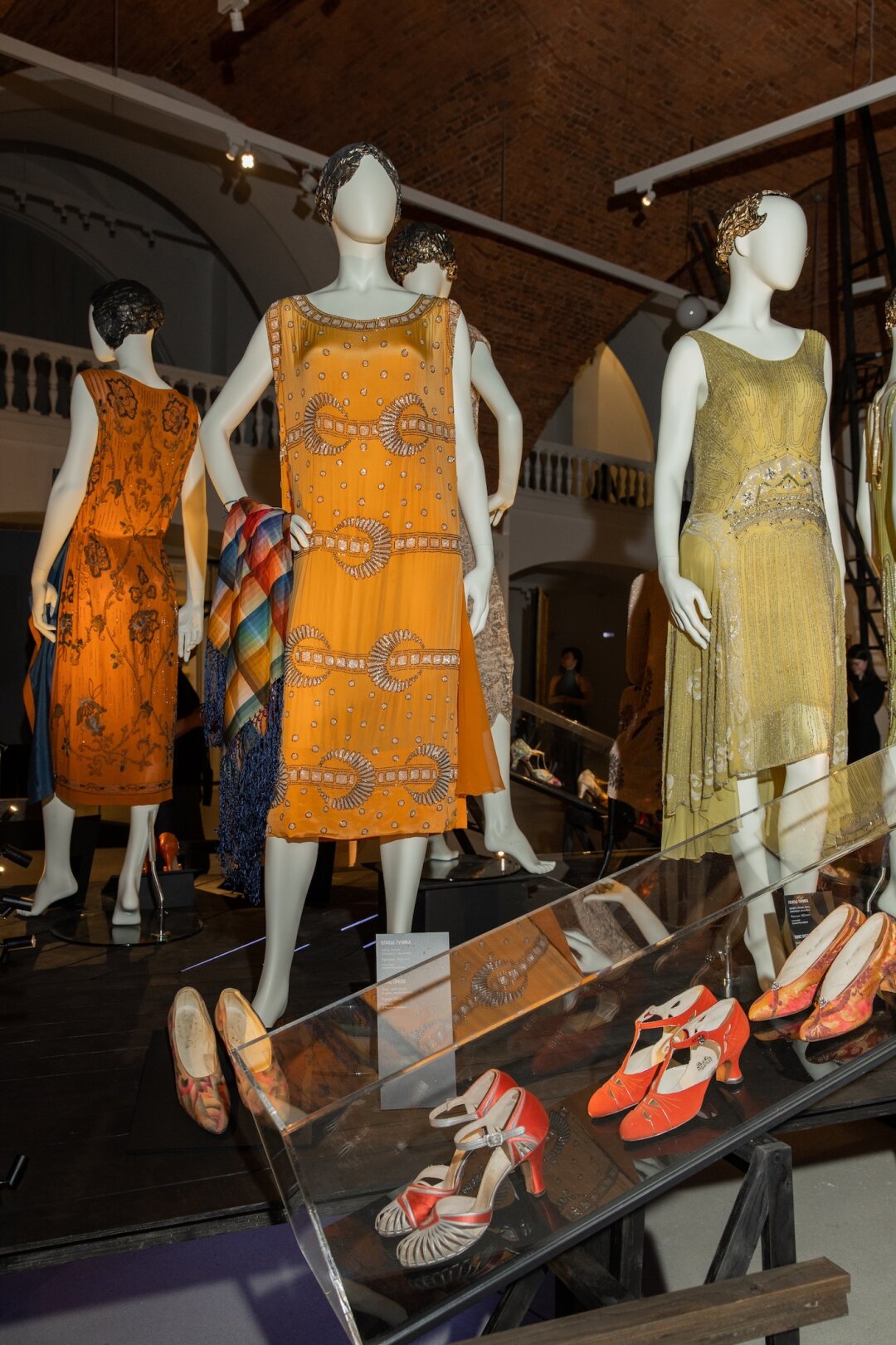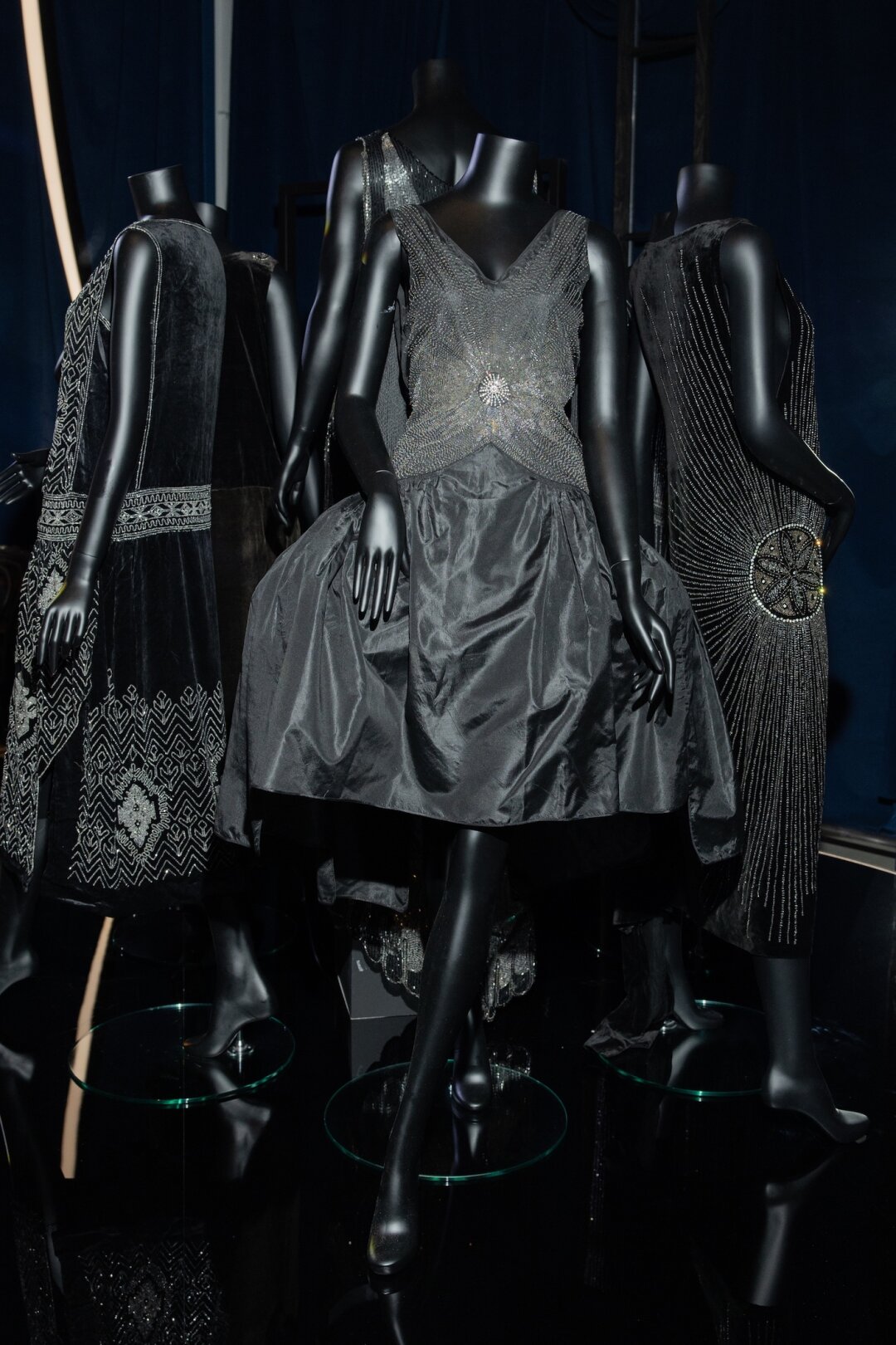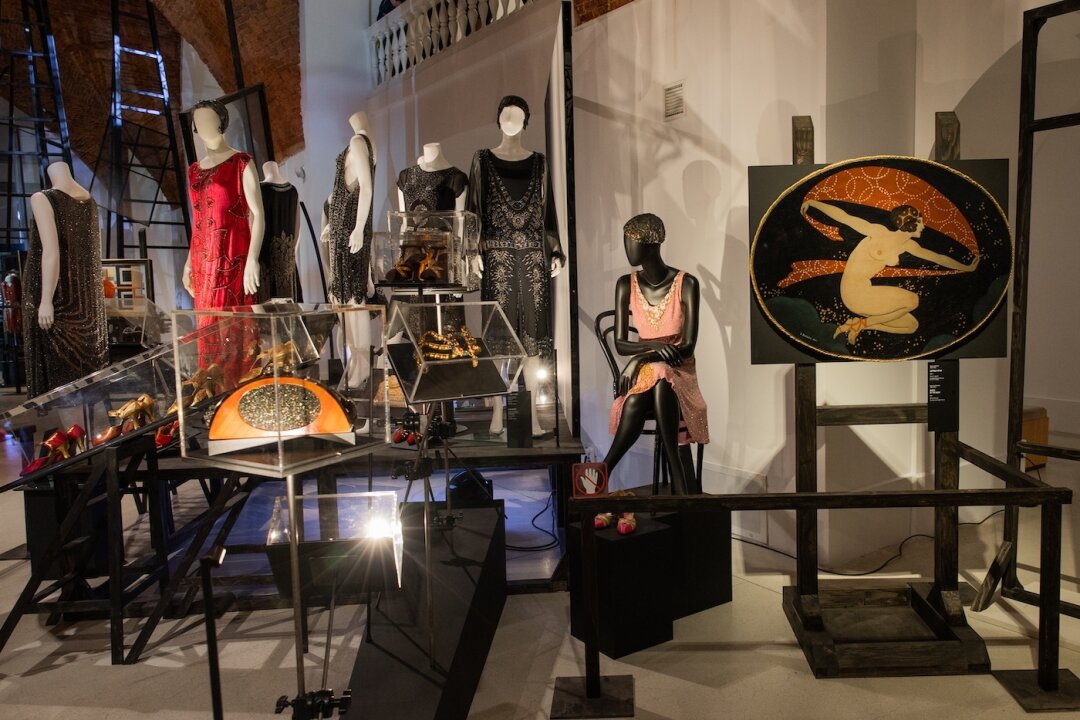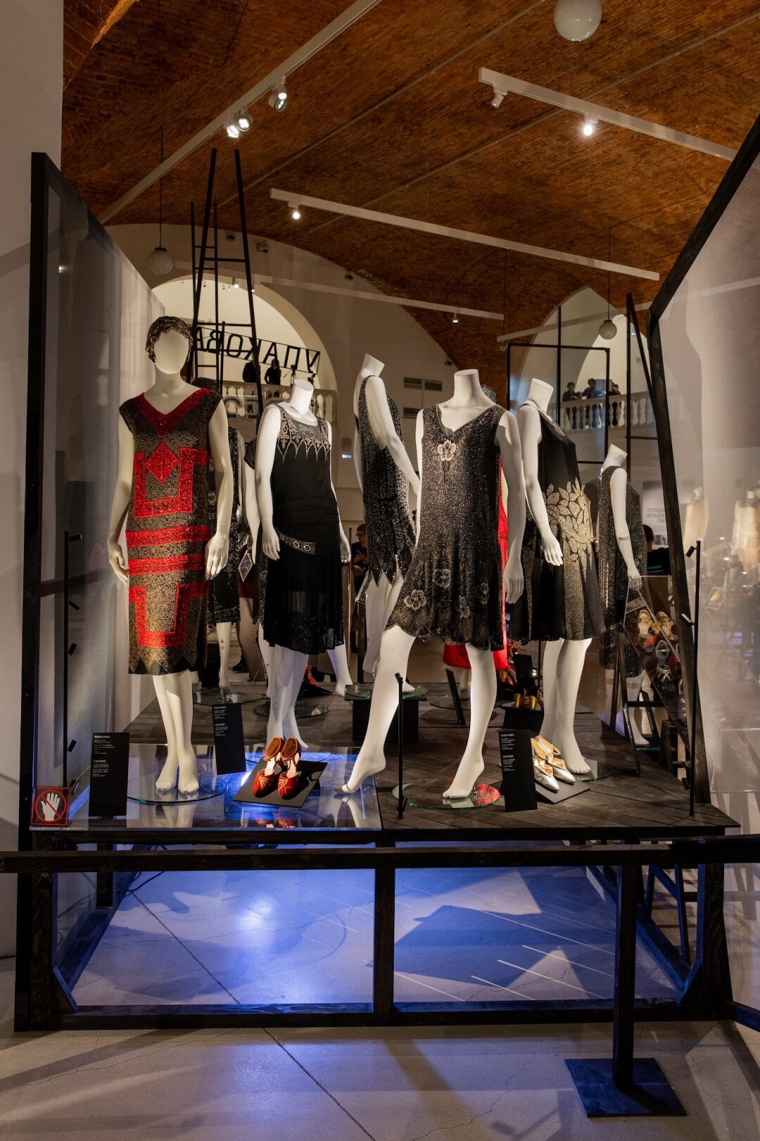 Манеж Малого Эрмитажа сейчас похож на закулисье модного показа или бродвейского театра. Привычное для музеев расстояние между зрителем и экспонатом максимально сокращено — художники не стали прятать в витрины роскошные наряды, ярко сияющие в полутьме выставочного зала узорами из бисера, стекляруса и пайеток. Костюмами, которые с радостью примерили бы современные модницы, можно не только полюбоваться из-за стекла, но и рассмотреть вблизи. А хронологическая лента и стилизованный фильм-реконструкция, снятый Ульяной Пихлак, делают эпоху объемной.