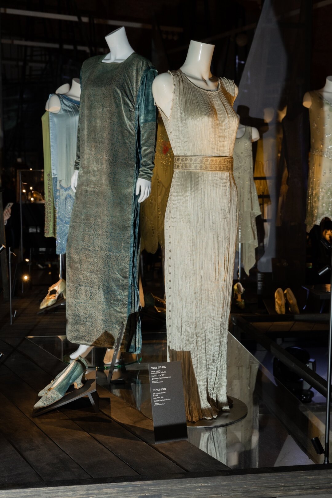 На выставке есть костюмы от главных модельеров «ревущих двадцатых»: Поля Пуаре, Эдварда Молино, Люсьена Лелонга, Мариано Фортуни и, конечно, Жанны Ланвен. Она открыла свое первое ателье еще в XIX веке, но всемирная слава пришла к дизайнеру в эпоху ар-деко. Визитной карточкой Ланвен стали платья Robe de Style с пышной юбкой на фижмах. Один из таких нарядов представлен в Эрмитаже.
