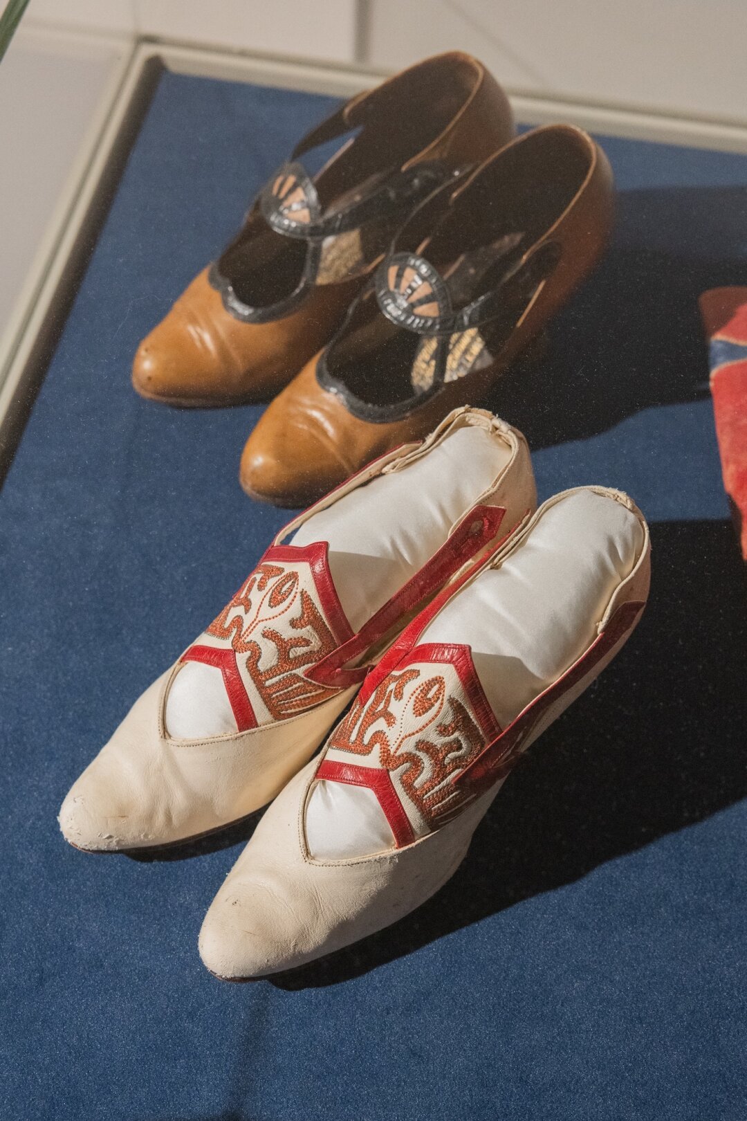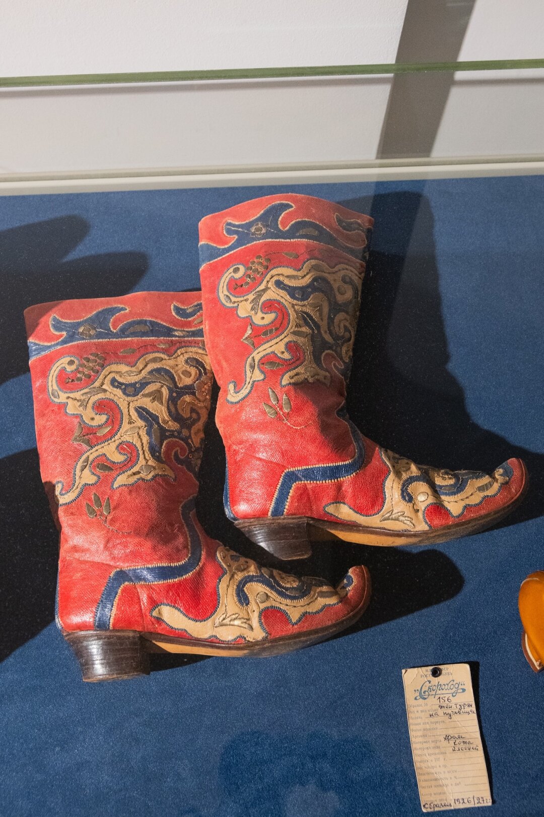 В России 1920-е годы — время конструктивизма, но обувь первых советских лет по силуэтам очень похожа на туфли ар-деко. Только для их изготовления не использовали золотую кожу, бархат и парчу. На выставке есть несколько отечественных моделей (включая туфли фабрики «Скороход»). Особенно хороши красные сапоги, украшенные татарской кожаной мозаикой, — в похожих под руку с Сергеем Есениным щеголяла Айседора Дункан.