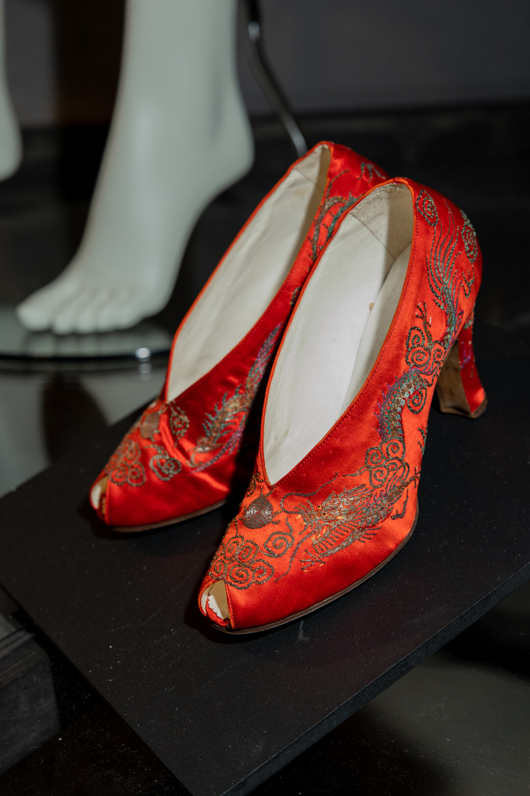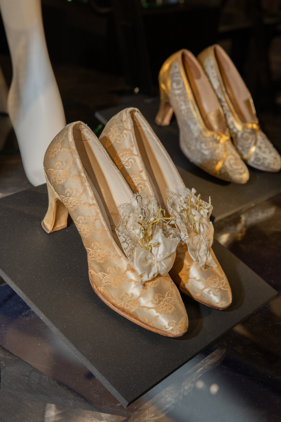 На выставке два платья дизайнера — плиссированное и бархатное, в комплект к которому идут туфли. Они сшиты из того же материала, что и сам наряд. Пару сделал известный английский мастер У. Х. Смит, являвшийся поставщиком королевского двора.