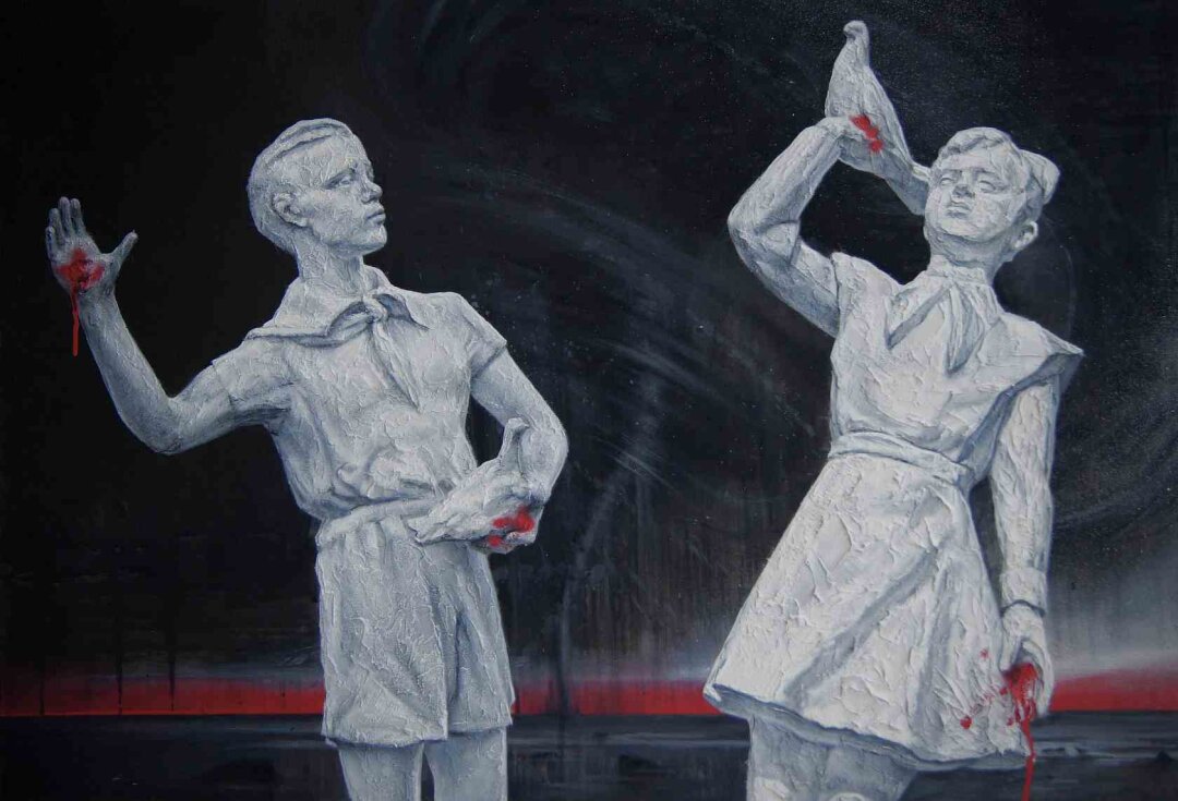 18 картин развесят как гипсовые изваяния в парке — спиной к спине. Композиционный центр инсталляции — культовый образ девушки с веслом (символе соцреализма 1930-х годов). Эта фронтальная фигура, как и у другие скульптуры, частично разрушилась и потеряла части себя во времени. От центральной скульптуры композиционно расходятся остальные образы. Через визуальную параллель с поврежденными памятниками автор поднимает широкий круг тем: о природе времени, различных типах сопротивления, уязвимости и победе.