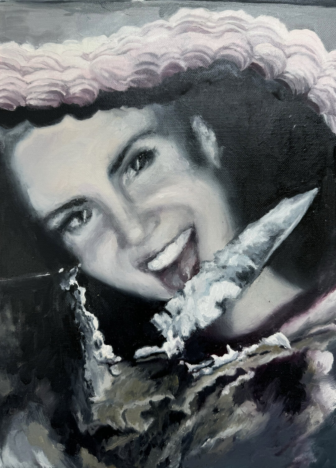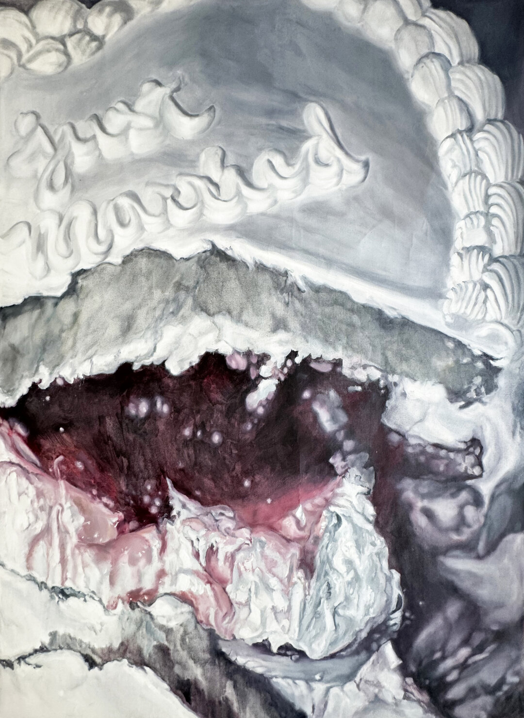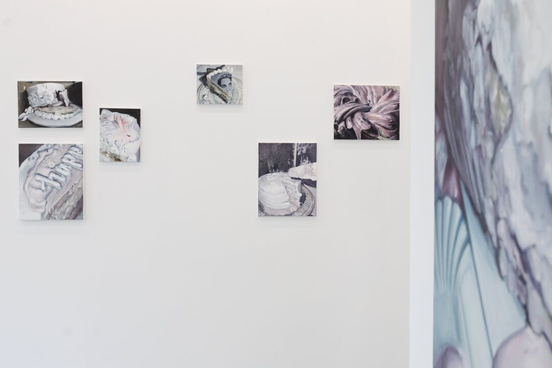«Серия живописи c тортами и другими моментами церемоний — это разговор о времени, ритуал отсчитывания года за годом. В этих работах я рассматриваю реальность через процесс трансформации и распада: зажатые между сюрреалистичным течением времени памятные фотографии несут в себе послания как свидетели и субъекты», — комментирует Алена.