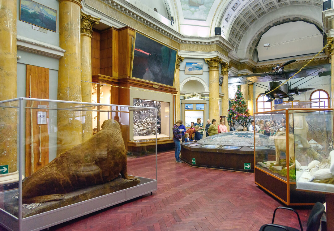 Экспозиция музея построена вокруг предметов, связанных с освоением Севера, или рассказывает о его природе — можно, например, увидеть самолет с борта парохода «Челюскин», диораму с пингвинами или рог нарвала.
