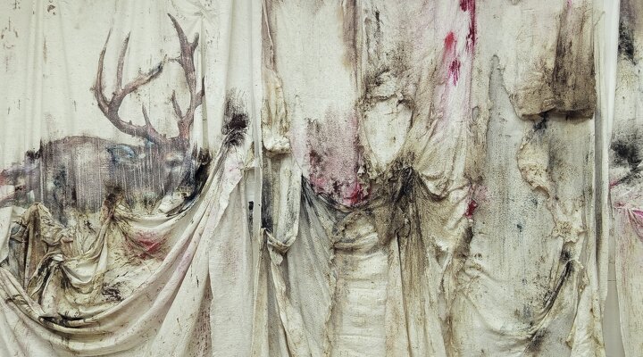 На деформированной, скомканной и произвольно сложенной ткани из отходов текстильного производства и старого белья художник изображает сцены «интуитивной археологии». Кровожадные сюжеты жанра таким образом остаются за кадром, а вся драматургия сосредоточена на абстрактных подсказках — контрастно-красных брызгах, изломах и прорехах на бланковых полотнах.