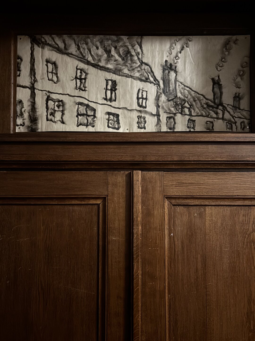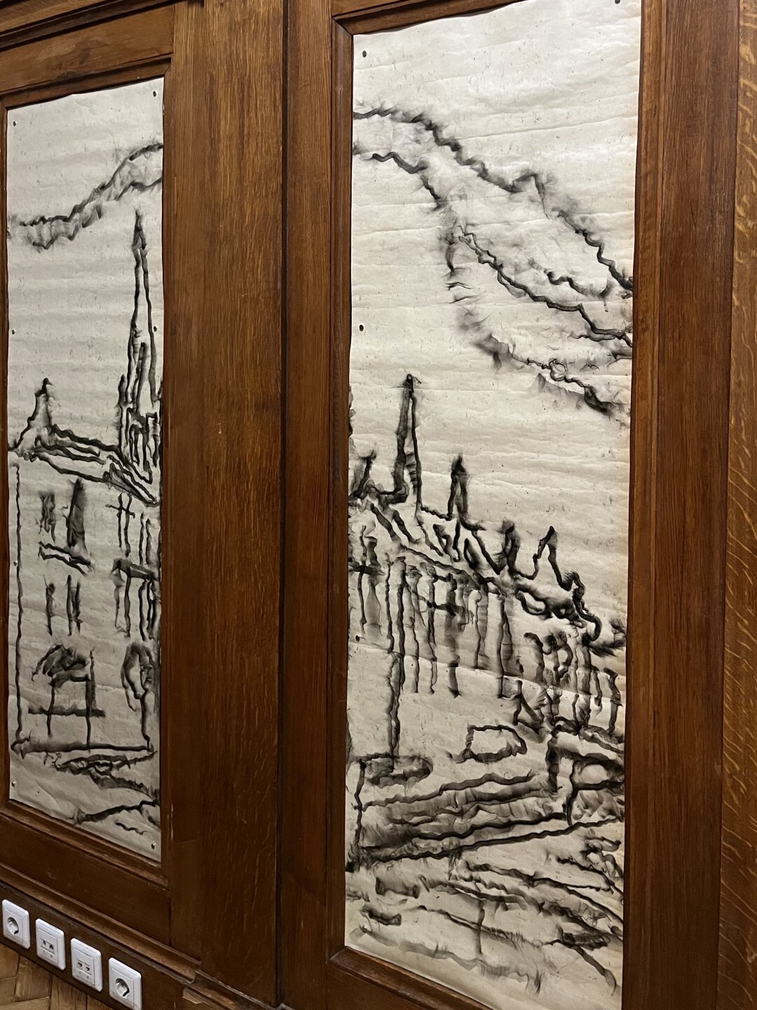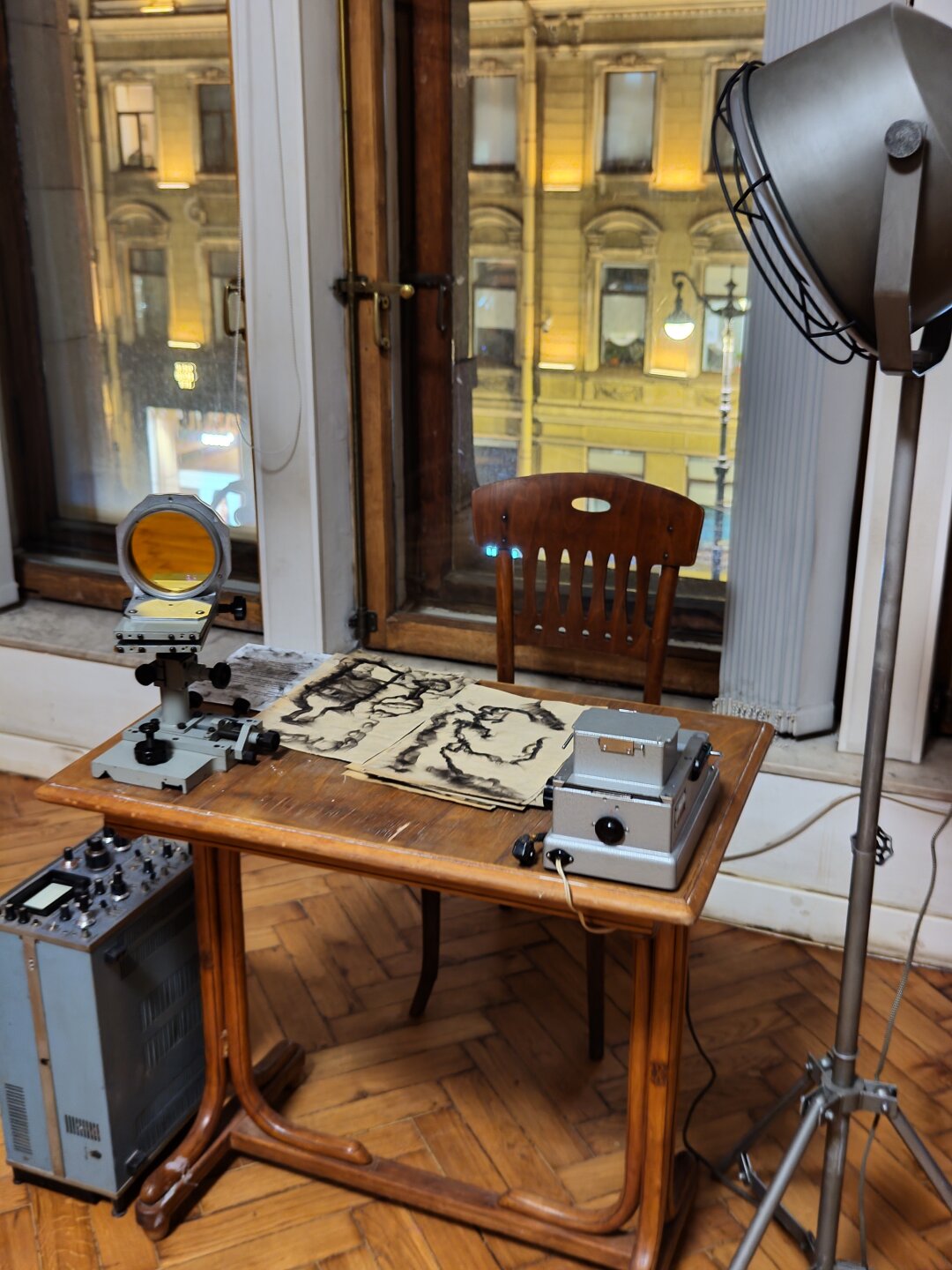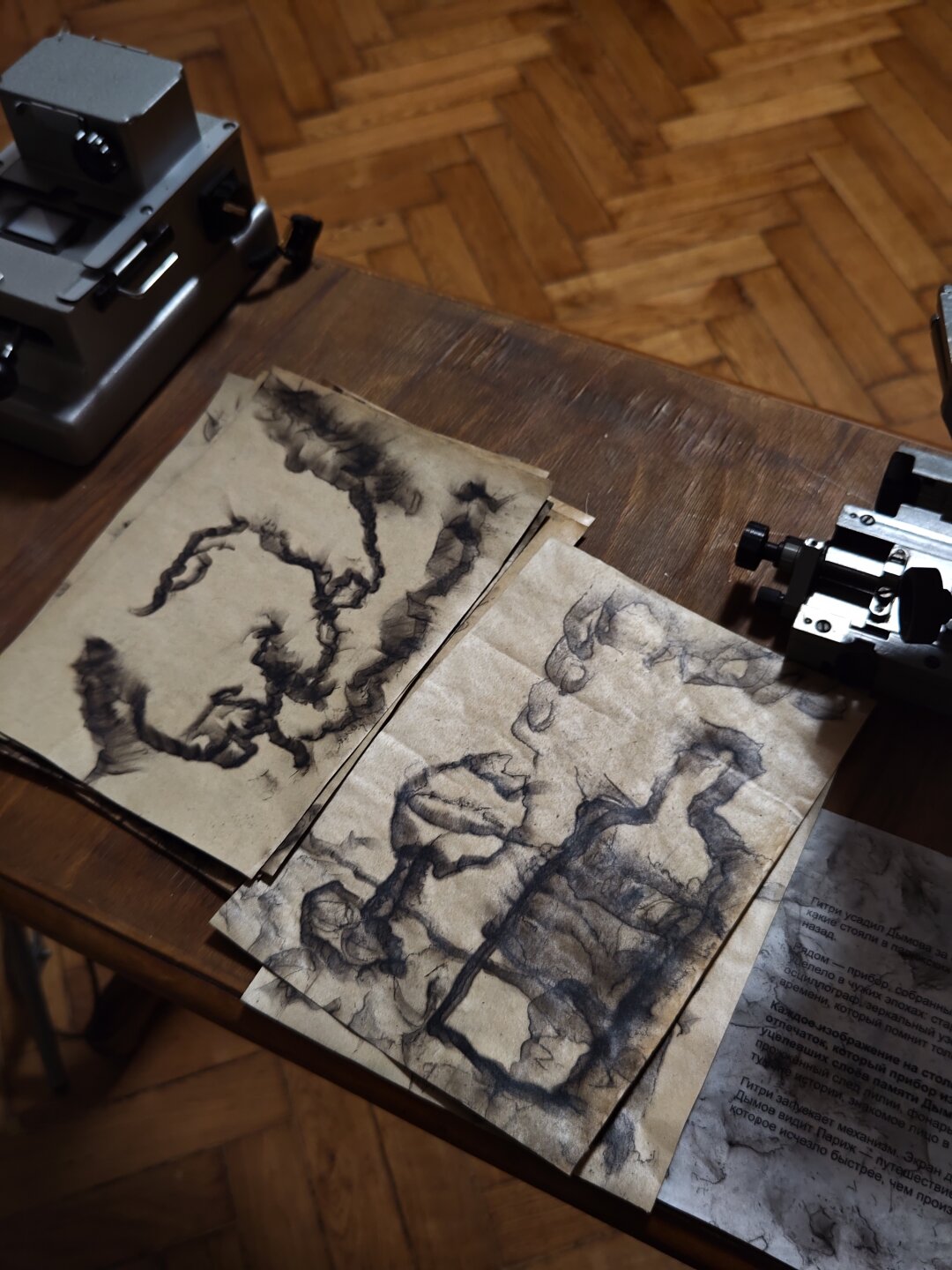 В экспозиции в дубовой гостиной представлены «дымографики» — работы в авторской технике, вдохновленной сюрреалистическим фюмажом и наивными рисунками зажигалкой. Это и большие дымовые панорамы Парижа, и малые форматы — иллюстрации-воспоминания, «восстановленные» прибором. Его роль исполняет инсталляция из ретро-оборудования Оптического института и аутентичной мебели начала XX века, предоставленной реставратором Александром Матющенко.