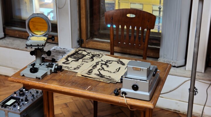 История такова: в здании Французского института раньше находился банк «Юнкеръ». Наш герой, писатель Осип Дымов, перед поездкой на «Русские сезоны» Дягилева в Париж зашел туда обналичить командировочный чек. Там он встретил жившего в этом доме французского актера Сашу Гитри. Мы соединили эту сайт-специфику места с нашей историей. Далее сюжет развивается, как в тексте. А выставка — это воспоминания Дымова, в подлинности которых он сам сомневается. У Гитри в доме есть прибор, купленный на блошином рынке, который помогает восстанавливать яркие, но утерянные воспоминания. На выставке этот прибор будет представлен: что-то вроде катушек Тесла и тумблеров, создающих научную атмосферу. Маленькие работы-воспоминания будут связаны с ним, а большие дымовые панорамы Парижа — висеть на стенах.