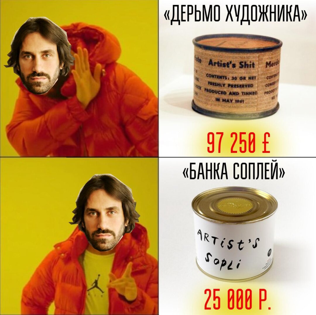 Художник Сергей Бонадрев продает свои сопли — петербургский ответ (за 25 000 рублей!) Пьеро Мандзони и его 90 банкам фекалий, самая дорогая из которых ушла в мае 2008 года с молотка Sotheby's за 97 250 фунтов стерлингов. Сам Мандзони объяснял жест радикальной критикой арт-рынка и его покупателей: «Я привлекаю внимание к доверчивости покупателей художественных произведений. Всем этим миланским буржуазным свиньям нравится только дерьмо».