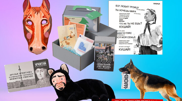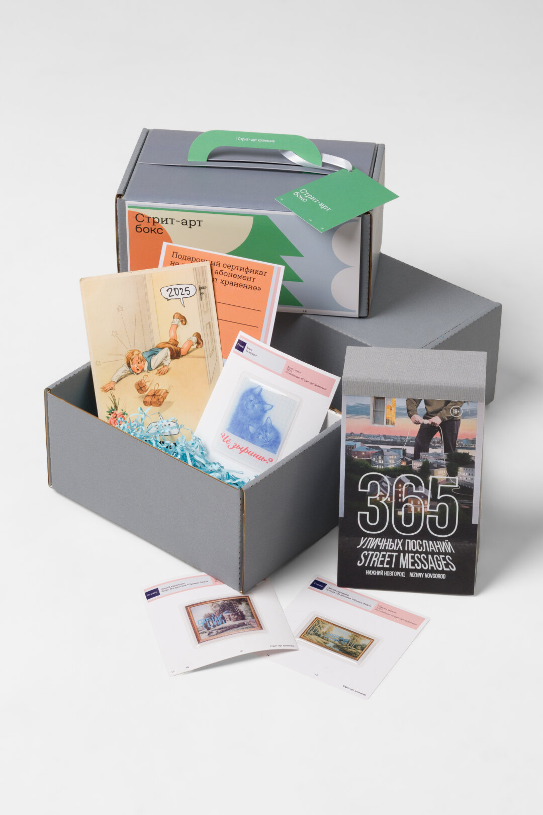 В «Стрит-арт хранении» ностальгируют по детству, пришедшемуся на нулевые. Поэтому собрали свои праздничные наборы, вдохновленные аналогами из школьных времен. Внутри — открытки, новогодние игрушки и стикеры от художников-резидентов, сертификат на экскурсию в институцию и книга «365 уличных посланий». А в каждом четвертом боксе — сюрприз: годовой абонемент на посещение хранения!