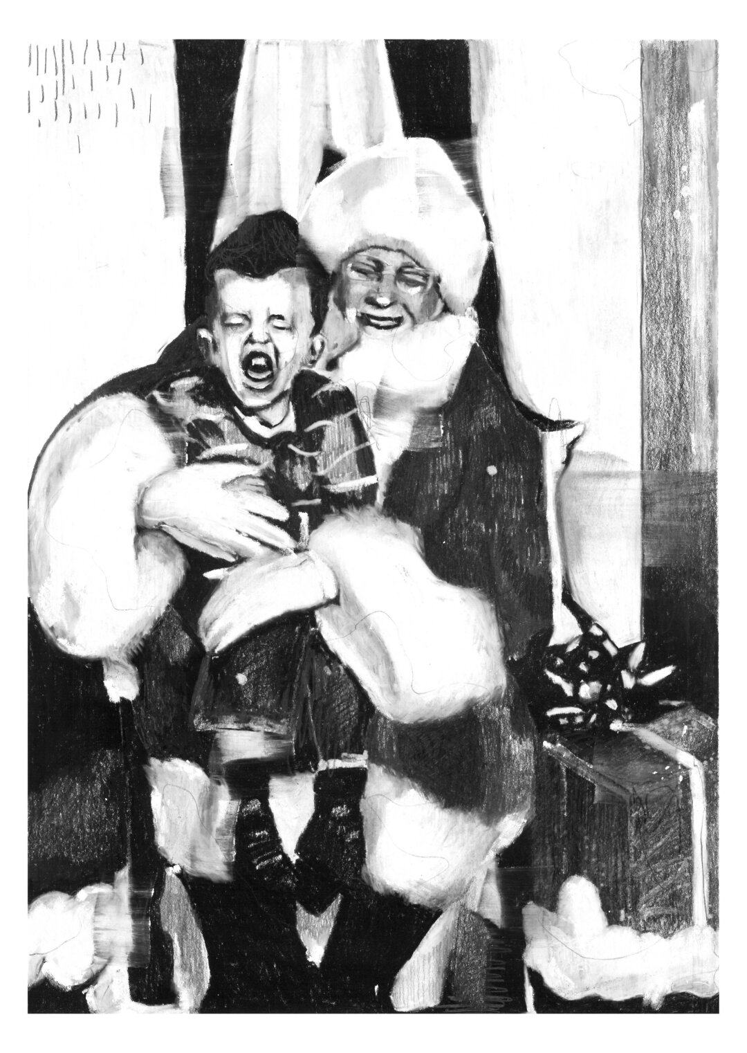 Постер от уличного художника Васи Truue про то, что Новый год — не всегда такое уж веселье. Даже если Дед Мороз все же пришел. Черно-белый кадр — как документ коллективного воспоминания о празднике, который почему-то не обрадовал.