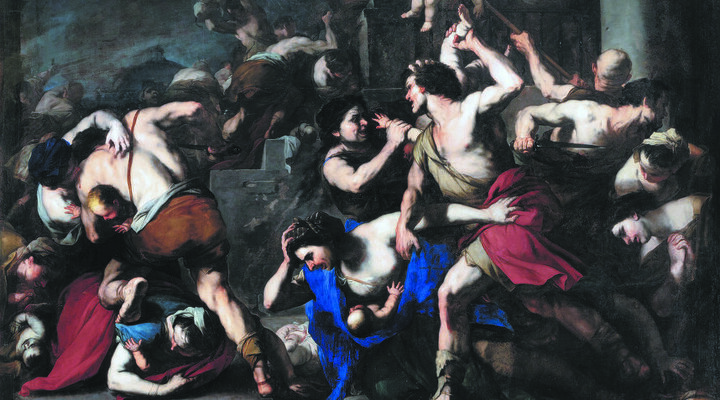 Лука Джордано — живописец и гравер неаполитанской школы эпохи барокко. Работу «Избиение младенцев» относят к раннему периоду творчества мастера. Из частных коллекций картина попала в Эрмитаж и до конца XIX века находилась там, а затем переехала в Гатчинский дворец. После революции ее отправили обратно, а в собрание Музея Академии художеств полотно поступило в 1935 году. К тому моменту «Избиение младенцев», накатанное на вал, было в плохом состоянии, с прорывами и изломами.