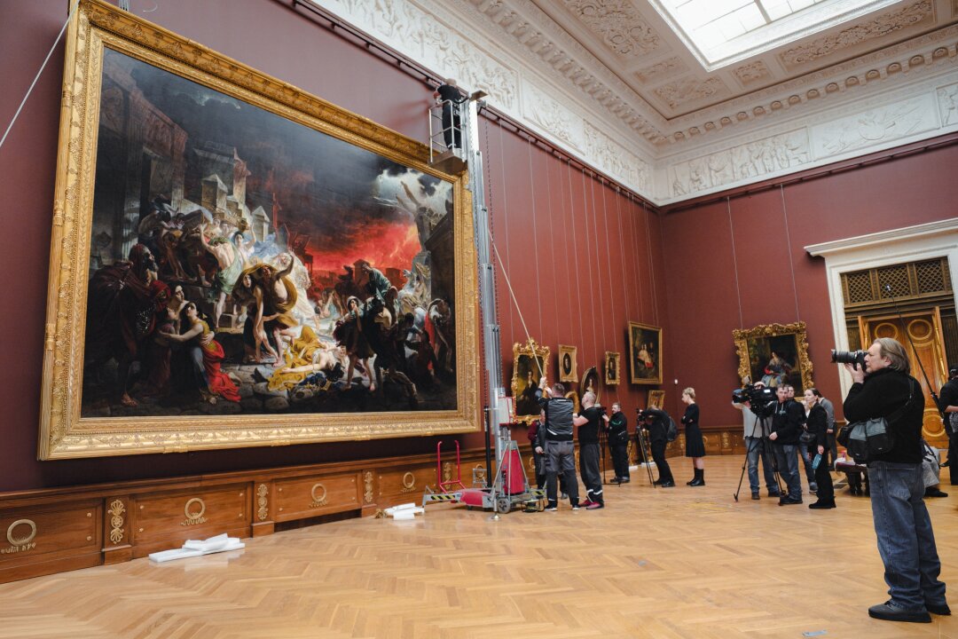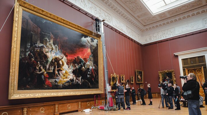 В Академическом зале №14 Михайловского дворца сотрудники Русского музея завершили монтаж картины Карла Брюллова «Последний день Помпеи». Полотно с сюжетом об извержении Везувия и еще 32 живописных произведения Брюллова из собрания Русского музея более семи месяцев экспонировали в Москве на выставке «Карл Брюллов. Рим — Москва — Петербург» в Государственной Третьяковской галерее.