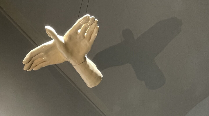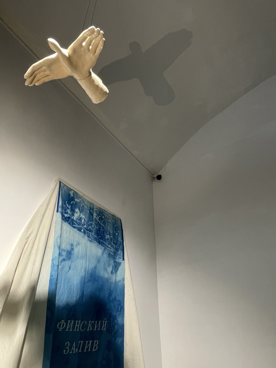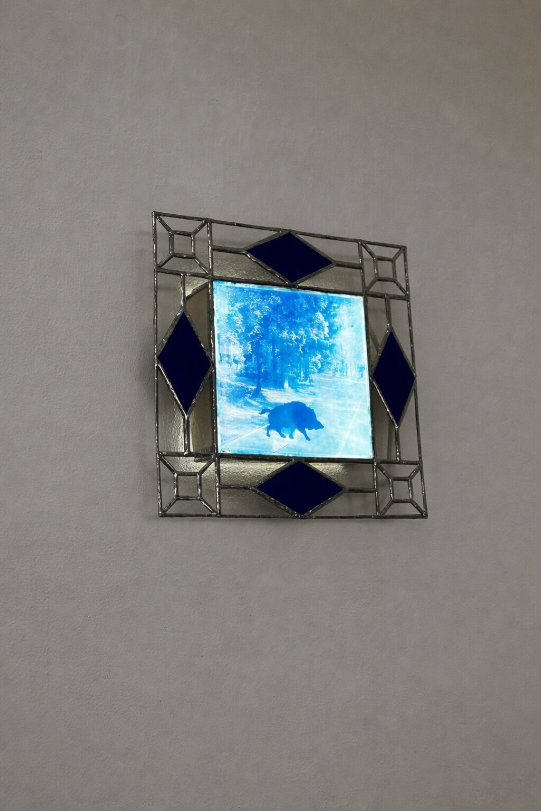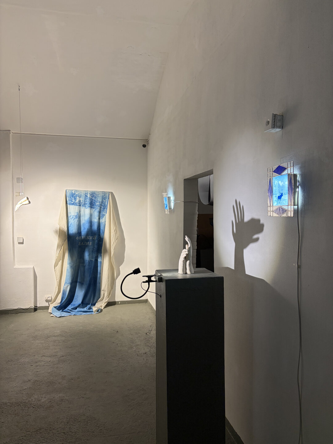 Художница Дарья Дерменжи работает с несколькими медиумами: керамикой, витражом и цианотипией. Силуэты животных, найденные на панорамах онлайн-карт, отпечатаны на стекле методом цианотипии и помещены в витражные лайтбоксы с рамами, повторяющими наличники старых дач вдоль шоссе. Керамические скульптуры рук отбрасывают тени, которые складываются в силуэты тех же животных. Цианотипия появляется в выставке в разных формах: помимо стекла, она используется на ткани, а также становится основой для аналоговой стоп-моушен анимации.