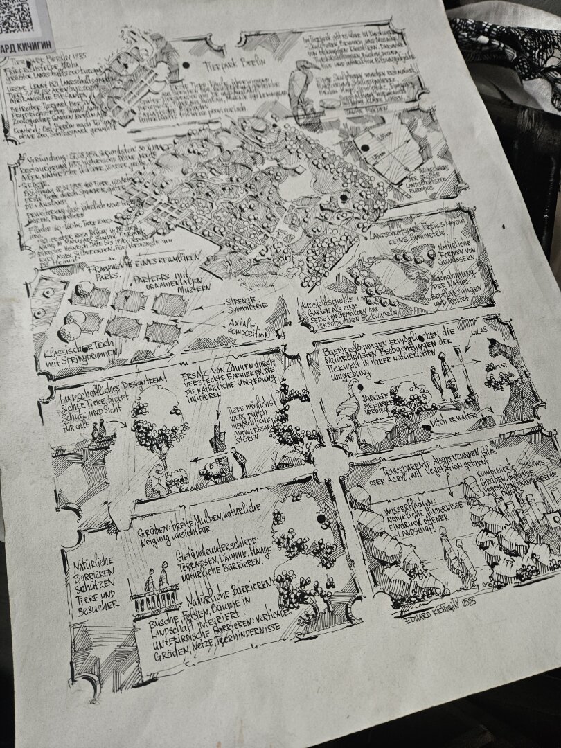 Генпланы — это про процесс самосовершенствования. Бывают наброски в скетчбуках, а это как будто урбанистические зарисовки. Просто они эстетизированы, и туда добавлены различные элементы. Вот, например, собор Петра и Павла: его локация, развитие, ситуация 1705 года. И дальше уже начало Петербурга: крепость, основные постройки, даже Адмиралтейство намечено. По сути, это ряд зарисовок.