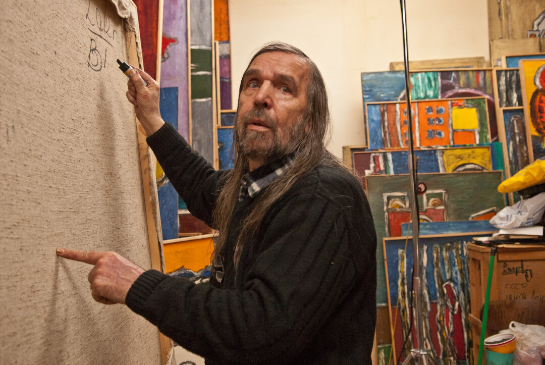Мое первое знакомство с Бобом Кошелоховым произошло в «Сайгоне». Его природная харизма, разговоры о философии и образ бородатого бродяги притягивали внимание. Он один из пионеров «Пушкинской-10», в которой располагалась его обитель. Мастерская Боба была особым местом —под стать фигуре художника-титана. Это наполненное плотным сигаретным дымом пространство с тесными рядами живописи, коробок с красками, большим количеством книг и следами бытования. Боб проводил там практически все время: жил, работал и спал на небольшой кушетке.