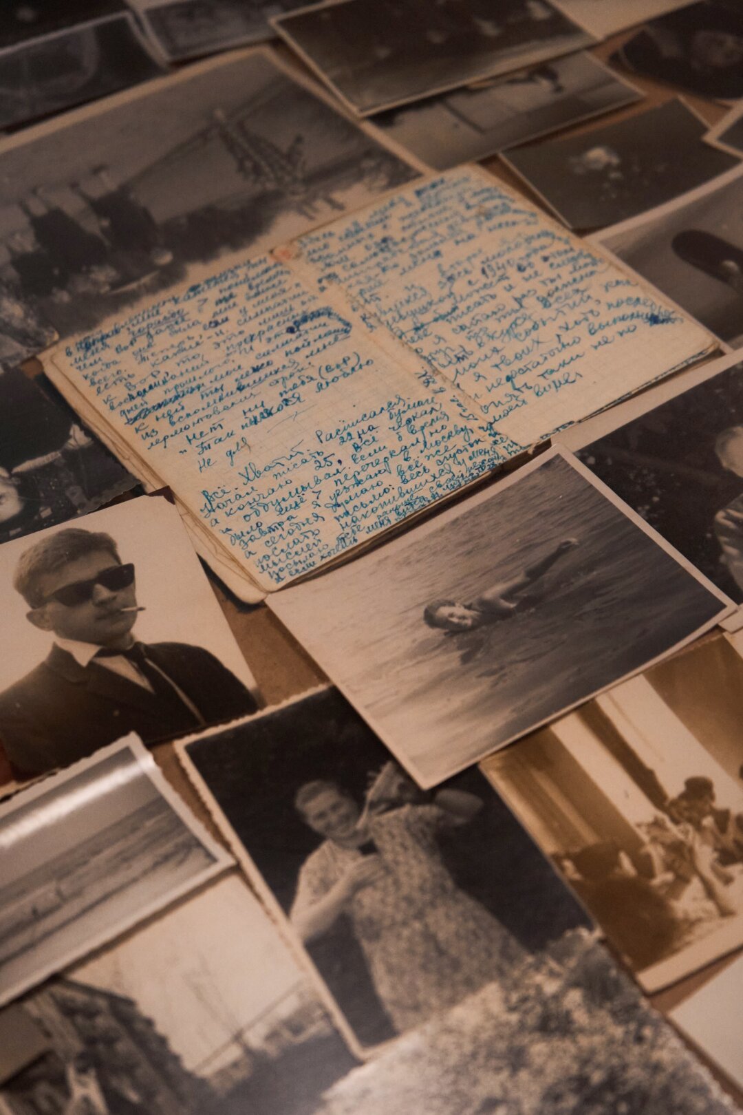 На столе кураторы разложили фотографии из частной жизни, сделанные обычными людьми в хрущевскую оттепель. Снимки, а также дневники свидетелей эпохи больших ожиданий предоставил центр «Прожито» (проект Европейского университета, который собирает, изучает и публикует личные дневники на русском языке — Прим. ред.) (их можно посмотреть, перейдя по куар-коду).