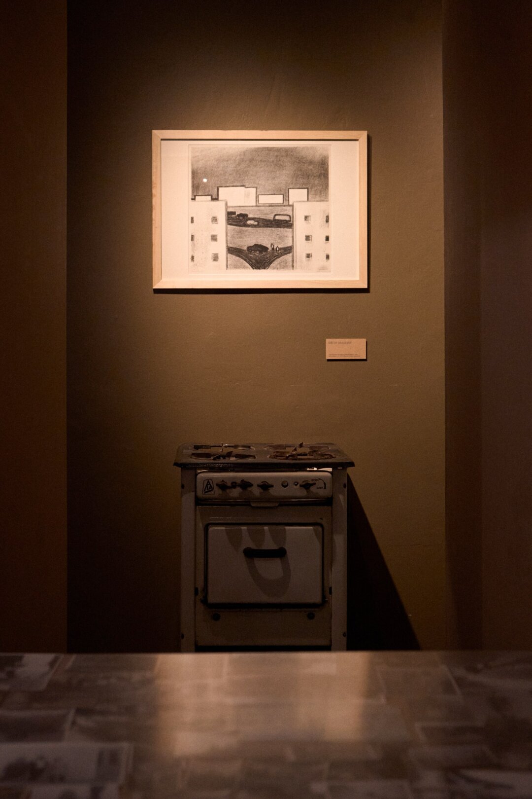 Изначально Петр и Вера, архитекторы бюро «Катарсис», предлагали растянуть стол, который стоит на первом этаже, на всю выставку. Чтобы он действительно полз из комнаты в комнату, как в коммунальной квартире на застолье. Потом мы поняли, что даже если получится это реализовать физически, нормы пожарной безопасности не будут соблюдены. От идеи отказались, но, кроме стола в первом зале, остался своеобразный рудимент в виде узенькой стойки в разделе «рюмочная». За похожими люди могли собираться и что-то обсуждать. Нам показалось, что будет здорово обыграть эту форму. Посетитель может опереться на стойку, а в качестве собеседников на противоположной стороне появляются не люди, а работы.