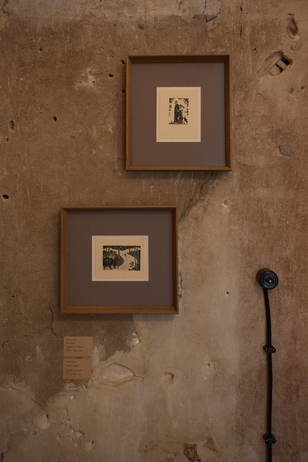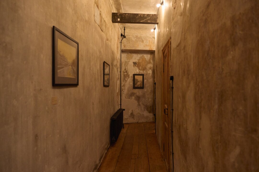 Из кухни зрители попадают в коридор, где висят петербургские пейзажи: акварели Николая Лапшина и литографии Владимира Конашевича из серии «Ленинград. Новые пейзажи» в мирискусническом духе. Так кураторы задают для посетителей атмосферу города, в котором жили обэриуты — главные герои выставки.