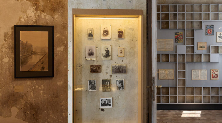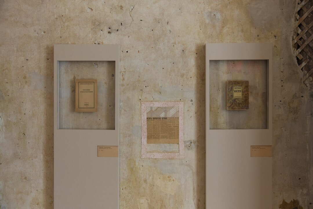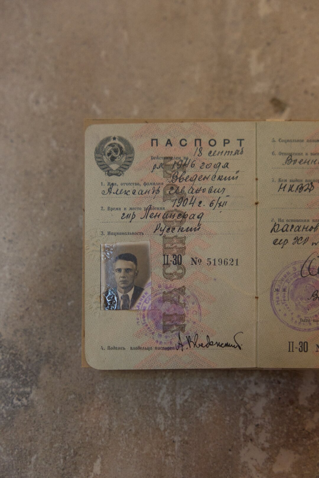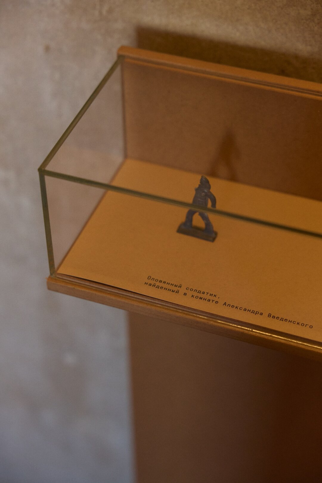 Тут разместили всего три экспоната. Два из них нашли здесь же, под полом, — это оловянный солдатик и огрызок карандаша. Третий — единственный предмет не из коллекции музея. Это паспорт Введенского, полученный им 18 сентября 1941 года в Харькове. 27 сентября поэта арестовали по обвинению в контрреволюционной деятельности. Он умер во время этапа, по официальным данным — 19 декабря 1941-го. Так что снимок в этом паспорте — одна из последних фотографий Введенского.