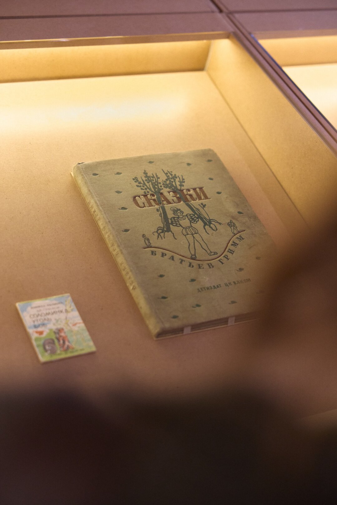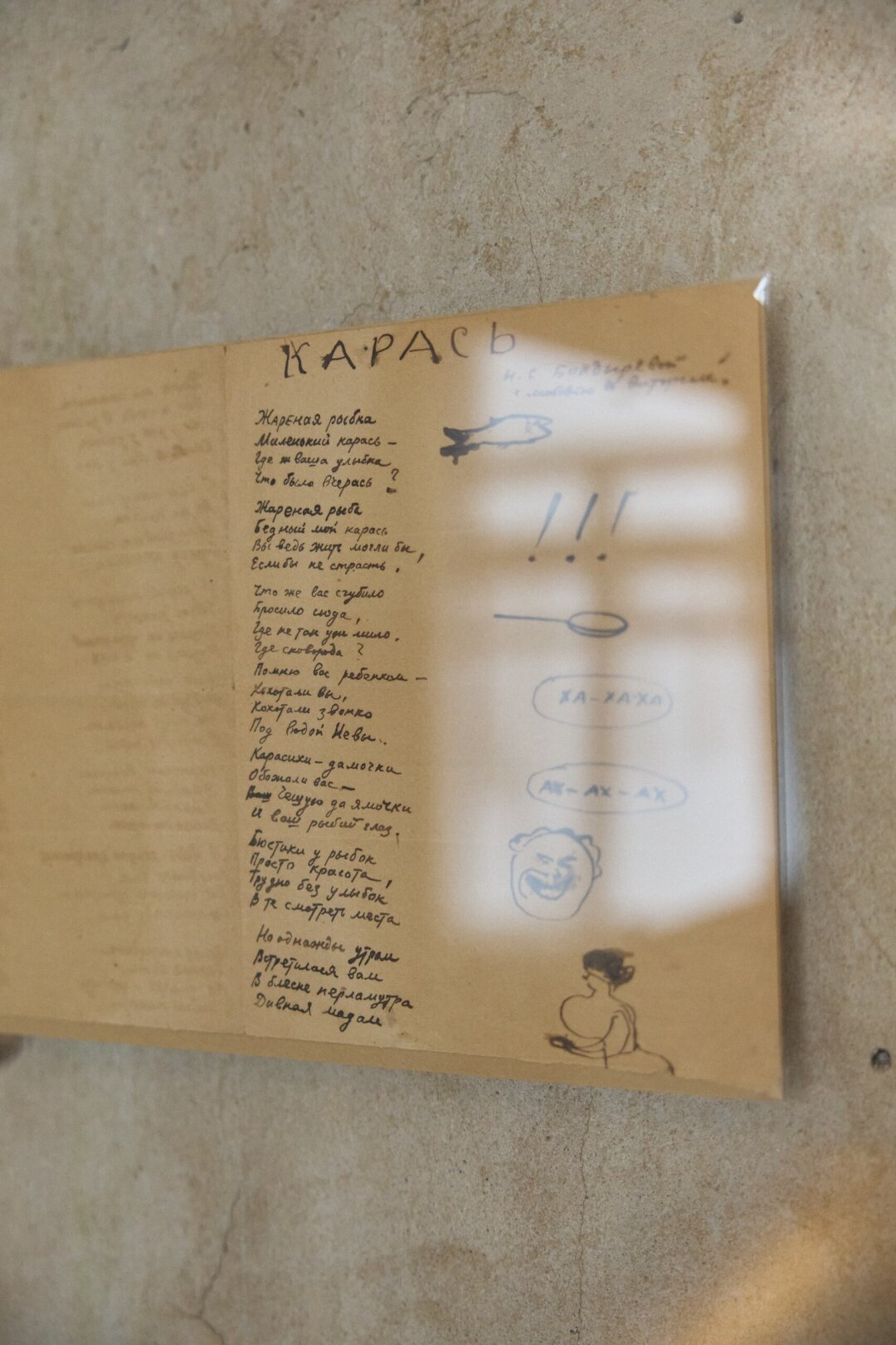 Следующая комната, где когда-то жили сестры Александра Введенского, посвящена Николаю Олейникову, поэту и первому главному редактору журнала «Еж». Именно он привел друзей-обэриутов в издательство «Детгиз». Здесь показывают редкие выпуски «Ежа» и уникальный автограф со стихотворением «Карась» (на его текст Шостакович даже хотел писать оперу!) с авторскими рисунками и посвящением легендарному редактору — Наталье Болдыревой.