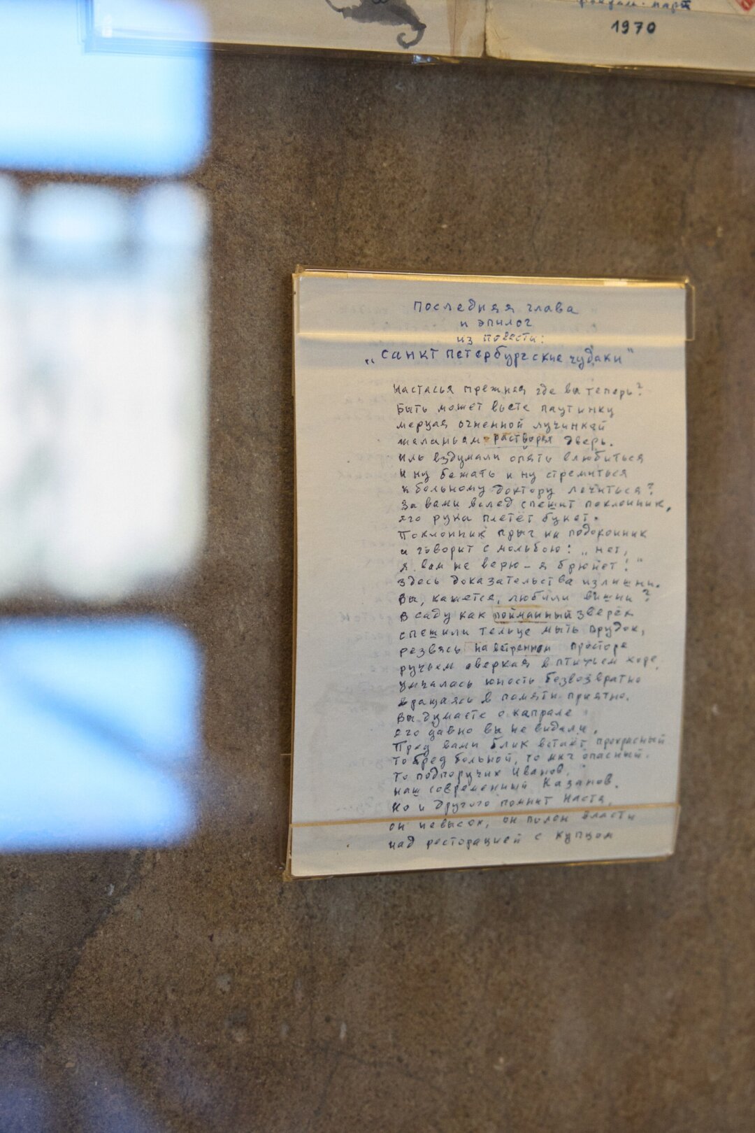 Экспозиция двух последних комнат строится вокруг Александра Введенского. В «столовой» показывают его книги с иллюстрациями. В том числе «Рыбаков» с автолитографиями Веры Ермолаевой, чьи рисунки, сделанные на Кольском полуострове, очень вдохновили поэта.
