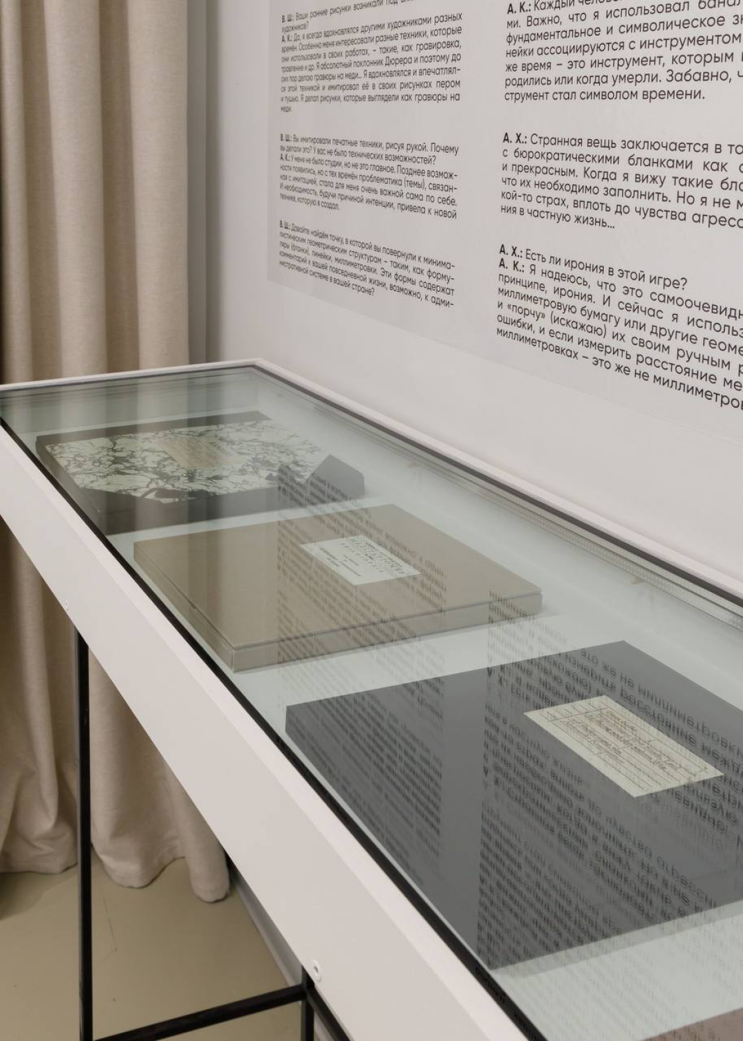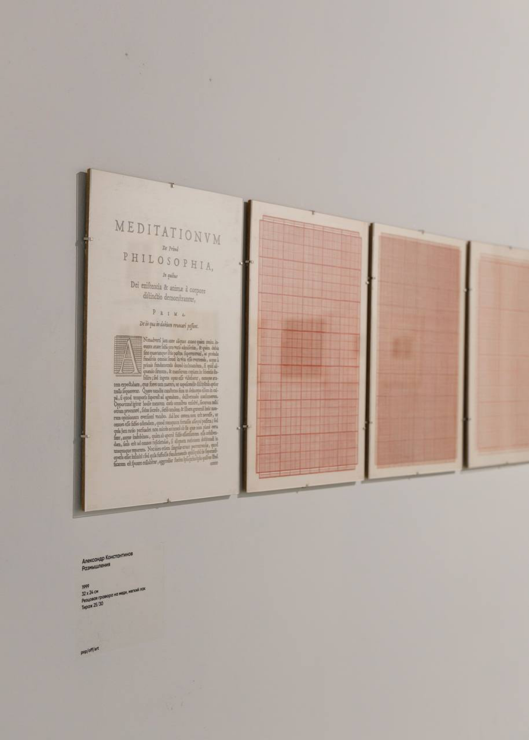 Математик по образованию и художник по призванию, Константинов превращал повседневные артефакты бюрократии: формуляры, линейки, миллиметровую бумагу — в художественные высказывания о второй природе человека. В экспозицию вошли четыре серии минималистских работ — «графических размышлений» к сочинениям Кафки и Декарта.